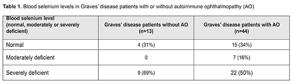 No significant difference in blood selenium level was found between the groups (60.07±7.61 against 34.4±10.2 μg/l; Р>0.05). Therefore, irrespective of the presence or absence of AO, most patients with GD exhibited severe Se deficiency, which requires administration of selenium agents. These findings are in agreement with those reported by other studies on selenium deficiency in thyroid disorders in Ukraine, with severe selenium deficiency observed in patients with autoimmune thyroid disorders [17]. Patients with moderate and severe selenium deficiency are likely to differ in selenium treatment regimen required and duration of selenium treatment. The research is underway on this subject. Conclusion First, irrespective of the presence or absence of AO, 54% of patients with Graves’ disease were found to exhibit severe selenium deficiency. Second, the mean blood selenium level in patients with Graves’ disease associated with AO was 60.07 ± 7.61 μg/l, and 50% of these patients exhibited severe selenium deficiency. In addition, the mean blood selenium level in patients with Graves’ disease only was 34.4 ± 10.2 μg/l, and 69% of these patients exhibited severe selenium deficiency. There was, however, no significant difference in blood selenium level between groups (Р > 0.05). Therefore, it may be assumed that selenium deficiency is not a factor affecting the development of AO in Graves’ disease. Finally, given that fact that 34% of patients with Graves’ disease associated with AO exhibited no selenium deficiency, such patients should not be prescribed selenium agents without first checking their blood selenium levels. References 1.Przybylik-Mazurek E, Zagrodzki P, Kuźniarz-Rymarz S, Hubalewska-Dydejczyk A. Thyroid disorders-assessments of trace elements, clinical, and laboratory parameters. Biol Trace Elem Res. 2011 Jun;141(1-3):65-75. doi: 10.1007/s12011-010-8719-9. 2.Böck A, Forchhammer K, Heider J, Baron C. Selenoprotein synthesis: an expansion of the genetic code. Trends Biochem Sci. 1991 Dec;16(12):463-7. 3.Schomburg L. Selenium, selenoproteins and the thyroid gland: interactions in health and disease. Nat Rev Endocrinol. 2011 Oct 18;8(3):160-71. 4.Hardy G, Hardy I, Manzanares W. Selenium supplementation in the critically ill. Nutr Clin Pract. 2012 Feb;27(1):21-33. 5.Rayman MP. Selenium and human health. Lancet. 2012 Mar 31;379(9822):1256-68. 6.Schomburg L, Köhrle J. On the importance of selenium and iodine metabolism for thyroid hormone biosynthesis and human health. Mol Nutr Food Res. 2008 Nov;52(11):1235-46. 7.Papp LV, Lu J, Holmgren A, Khanna KK. From selenium to selenoproteins: synthesis, identity and their role in human health. Antioxid Redox Signal. 2007 Jul;9(7):775-806. 8.Köhrle J. Pathophysiological relevance of selenium. J Endocrinol Invest. 2013 Nov;36(10 Suppl):1-7. 9.Köhrle J, Jakob F, Contempré B, Dumont JE. Selenium, the thyroid, and the endocrine system. Endocr Rev. 2005 Dec;26(7):944–84. 10.Gärtner R, Gasnier BC, Dietrich JW, Krebs B, Angstwurm MW. Selenium supplementation in patients with autoimmune thyroiditis decreases thyroid peroxidase antibodies concentrations. J Clin Endocrinol Metab. 2002 Apr;87(4):1687–91. 11.Bhuyan AK, Sarma D, Saikia UK. Selenium and the thyroid: A close-knit connection. Indian J Endocrinol Metab. Indian J Endocrinol Metab. 2012 Dec;16(Suppl 2):S354-5. doi: 10.4103/2230-8210.104090. 12.Contempre B, Denef JF, Dumont JE, Many MC. Selenium deficiency aggravates the necrotizing effects of a high iodide dose in iodine deficient rats. Endocrinology. 1993 Apr;132(4):1866–8. 13.Contempre B, Le-Moine O, Dumont JE, Denef JF, Many MC. Selenium deficiency and thyroid fibrosis. A key role for macrophages and transforming growth factor beta (TGF-beta). Mol Cell Endocrinol. 1996 Nov 29;124(1-2):7-15. 14.Rasmussen LB, Schomburg L, Köhrle J, Pedersen IB, Hollenbach B, Hög A, et al. Selenium status, thyroid volume, and multiple nodule formation in an area with mild iodine deficiency. Eur J Endocrinol. 2011 Apr;164(4):585-90. 15.Triggiani V, Tafaro E, Giagulli VA, Sabbà C, Resta F, Licchelli B, Guastamacchia E. Role of iodine, selenium and other micronutrients in thyroid function and disorders. Endocr Metab Immune Disord Drug Targets. 2009;18:277–94. 16.Doupis J, Stavrianos C, Saltiki K, Mantzou E, Mastrokostopoulos A, Philippou G, Alevizaki M. Thyroid volume, selenium levels and nutritional habits in a rural region in Albania. Hormones (Athens). 2009 Oct-Dec;8(4):296-302. 17.Goncharova OA. [Selenium and the thyroid gland (literature review and own research data)]. Endokrynologiya. 2014;19(2):149–55. Ukrainian. 18.Corvilain B, van Sande J, Laurent E, Dumont JE. The H2O2-generating system modulates protein iodination and the activity of the pentose phosphate pathway in dog thyroid. Endocrinology. 1991 Feb;128(2):779-85. 19.Corvilain B, Laurent E, Lecomte M, Vansande J, Dumont JE. Role of the cyclic adenosine 3',5'-monophosphate and the phosphatidylinositol-Ca2+ cascades in mediating the effects of thyrotropin and iodide on hormone synthesis and secretion in human thyroid slices. J Clin Endocrinol Metab. 1994 Jul;79(1):152-9. 20.Girgis CM, Champion BL, Wall Jr. Current concepts in Graves' disease. Ther Adv Endocrinol Metab. 2011 Jun;2(3):135-44. 21.Ludgate M. Animal models of Graves' disease. Eur J Endocrinol. 2000 Jan;142(1):1-8. 22.Khalilzadeh O, Noshad S, Rashidi A, Amirzargar A. Graves' ophthalmopathy: a review of immunogenetics. Curr Genomics. 2011 Dec; 12(8): 564–75. 23.Weetman AP. Graves' disease. N Engl J Med. 2000 Oct 26;343(17):1236–48. 24.Taylor EW. Selenium and cellular immunity. Evidence that selenoproteins may be encoded in the +1 reading frame overlapping the human CD4, CD8, and HLA-DR genes. Biol Trace Elem Res. 1995 Aug-Sep;49(2-3):85-95. 25.Dhamasena A. Selenium supplementation in thyroid associated ophthalmopathy: an update. Int J Ophthalmol. 2014;7(2):365–75. 26.Rotondo Dottore G, Leo M, Casini G, Latr
