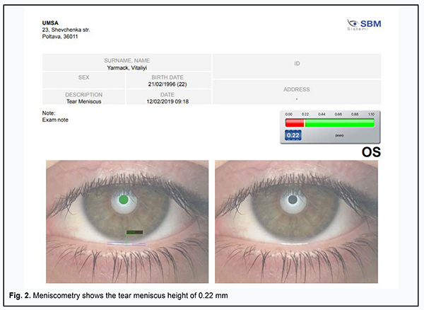 The tear meniscus height (TMH) measurements characterized the changes in the aqueous and mucin layers of the tear film. Thus, the TMH was <0.22 mm, an average of 17±0.12 mm (Fig. 2) in 42% (203 eyes); ≥0.22-25 mm, an average of 23±0.08 mm in 43% (211 eyes); and >0.25 mm, an average of 26.5±0.5 mm в 15% (72 eyes).