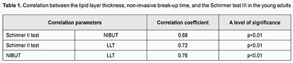 Tear film stability was assessed using the NIBUT test. Thus, toxicological effects of dyes were excluded. Tear film instability was noted in 57% (227 eyes). Thus, NIBUT was ≤5 s, an average of 4.6±0.06 s, in 13% (65 eyes); and <10 s, an average of 8.3±0.09 s, in 44% (212 eyes). Normal values of tear film stability were in 43% (209 eyes); of them, ≤15 s, an average of 13.7±0.05 s, in 23% (114 eyes); ≤20 s, an average of 17.9±0.1 s, in 20% (95 eyes). Lid-parallel conjunctival folds (LIPCOF) were evaluated biomicroscopically in the area of inferior lateral quadrant of the conjunctiva. LIPCOF-0, LIPCOF-1, LIPCOF-2 were revealed in 25% (123 eyes), 53% (259 eyes), and 21% (104 eyes), respectively; LIPCOF-3 was not revealed. Basal tear production was defined using the Schirmer II test, which showed disorders in 53% (259 eyes). Of them, the Schirmer II test values varied from 2 to 5 mm, averaging 4.13±0.02, in 16% (75 eyes) and from 6 to 10 mm, averaging 8.06±0.5, in 38% (184 eyes). Normal values of the Schirmer II test, >10 mm, were revealed in 47% (227 eyes); of them, 38% (182 eyes) had the Schirmer test value of 14±1.08, ranging from 10 to 15 mm, and 9% (45 eyes) had the Schirmer test value more than 15 mm, averaging 18±1.02. The data obtained demonstrate a significant correlation between the NIBUT, Schirmer and LLT tests (Table 1). Thus, the LLT ranged from 15 to 120 μm, the time of first deformation of the tear film was 3 to 20 s with an average of 11.43±3.45, and the Schirmer test showed from 2 to 21 mm per 5 min with an average of 9.04±3.28. The dependence between the above tests was positive and had a strong significant correlation (Table 2), which indicates that these tests can be used for qualitative assessment of the ocular surface.