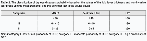 Introduction Dry eye disease (DED) is a chronic disease which affects millions of people worldwide. The incidence of DED ranges from 5 to 50% [8]. Such a wide range is due to the absence of the unified standard for DED diagnosis [11, 13, 14, 9, 2]. DED is more often described as a disease affecting older people [1]; however, the latest findings of international studies have demonstrated a demographic shift of DED [8]. This is facilitated by a multi-screen lifestyle, contact lens wear, refractive surgery complications, stress and other aspects which make the youngsters potential patients of an ophthalmologist [5, 3, 7]. Besides, there are significant difficulties in assessing the tear film, which make it complicated to study the ocular surface. They include the compensation of biological changes in the tear film composition by tear hypersecretion and the effect of diagnostic dyes on the tear break-up time, which lead to obtaining the false-positive results in standard testing methods. One of the recent methods to assess the quality and lipid layer thickness (LLT) of the tear film is interferometry. Based on the studies having assessed LLT in general population using a LipiView II Ocular Surface Interferometre, the data for interpretation have been determined as follows: more than 70 nm as norm; 70 to 50 nm as mild DED; and less than 50 nm as severe DED [12, 16]. However, in the available literature, there are no data on studying the qualitative state of the tear film in young adults, who are the most working-able users of digital gadgets, which gives the rationale for conducting the research in this area. Purpose. To study the quantitative characteristics of the tear film in young adults. Material and Methods The study was conducted at Otorhinolaryngology and Ophthalmology Department of Ukrainian Medical Stomatological Academy, Poltava, Ukraine. The study followed ethical and juridical principles according to World Medical Association Declaration of Helsinki. The exclusion group consisted of contact lens wearers, excimer-laser corrected patients, patients with inflammation of the eye and eyelid, and patients using any kind of eye drops. The study was performed within the autumn and winter period in a room with district heating; neither heaters nor air conditioner were used additionally. The temperature ranged from 20 to 23ºС, averaging 21.47±0.61 ºС; relative humidity ranged within 45-60%, averaging 53±1.5. The data obtained were recorded using a digital thermal hygrometer (Beurer HM16, Germany), thrice a day. 486 eyes of 243 patients, aged from 18 to 30 with an average of (23±0.56), were examined. Of them, there were 161 women (66%) and 82 men (345). To define the state of the ocular surface, each examinee was asked to complete the Ocular Surface Disease Index (OSDI) questionnaire, recommended by TFOS International Dry Eye WorkShop (DEWS II) [15]. The severity of symptoms was assessed by comparing the number of all questions answered with the sum of scores for all questions answered. The OSDI was evaluated using a formula: OSDI=Dx25/Е, where D is the sum of scores for all questions answered, and E is the number of questions answered. Afterwards, the corresponding shade of red was matched to the key below the chart to determine whether patient’s score indicated normal, mild, moderate, or severe dry eye disease. Then, each patient was performed interferometer measurements, tear meniscus measurements, the non-invasive break-up time (NIBUT) test using the devices SBM ICP Tearscope (Italy) and iPad Pro (the USA). The lipid layer thickness (LLT) was measured through analyzing interference images by a color profile of the pre-ocular tear film in the eyes blinking. The videos obtained were compared to the classification installed in the device and including seven short videos with different thicknesses of the tear film lipid layer (160-120 nm; 80-120 nm; 80 nm; 30-80 nm; 30 nm; 15 nm; <15 nm). The tear meniscus was measured using a high-power pre-shot image; result <0.22 mm was considered as deviation from the norm. In the NIBUT test, a special film was inserted into the interferometer to form Placido rings. A patient was encouraged to blink freely and, then, to stop blinking for as long as possible. The Placido rings image was projected on the eye and its deformation was monitored and video recorded. The time between the last complete blink and the first indication of pattern break-up and image deformation was measured. The result ≥ 10 s was considered as norm [10]. Video and image records were observed in real time on the iPad Pro screen using the ICP app by SBM Sistem and archived in the MacBook Air file database. The data obtained were interpreted by two independent experts at different time and the mean value was calculated for every statistical case. Also, lid-parallel conjunctival folds (LIPCOF) were evaluated biomicroscopically in the area of inferior lateral quadrant of the conjunctiva and basal tear production was defined using the Schirmer II test, following the 0.5% alcaine anesthesia. The data obtained were statistically processed using the STATISTICA 6.0 applied software package (StatSoft. Inc., the USA) and the EXEL descriptive statistics package. Results Low values of the OSDI, from 10.4 to 12.5 (an average of 11.4±0.63), were noted in most young adults, in 62% (151 persons), which was a characteristic of the normal ocular surface; mild DED was noted in 22% (54 persons), corresponding to the OSDI = 13.9-22.7 (an average of 16.8±1.92); moderate DED was noted in 16% (38 persons), corresponding to the OSDI = 25-31.3 (an average of 16.8±1.92); no severe DED was noted. The interferometry findings were different from the subjective perception. Thus, most examinees, 64% (310 eyes), had LLT disorders. Significant changes in the LLT was noted in 33% (218 eyes); of them, the LLT was minimal, 15 nm, in 10% (46 eyes). the LLT was 30 nm and 30-80 nm in 23% (112 eyes) and 31% (1