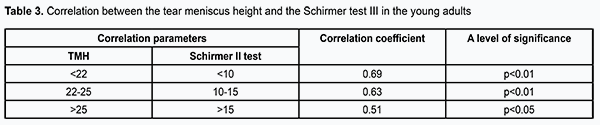 Based on the revealed correlation relationships, it was possible to make an interferometric classification to predict the occurrence of DED in young adults. According to the classification (Table 2), there are high rates of correlation on two sides of the LLT assessment scale in the SBM ICP Tearscope. When the LLT values were high, ≥80 nm in 36% (176 eyes), the NIBUT values were also increased and the Schirmer test values were increased in 35% (168 eyes) of 36% (176 eyes). When the LLT values were low, <80 nm in 64% (310 eyes), the NIBUT values were below the normal ranges in 54% (264 eyes) of 64% (310 eyes) and the Schirmer test values were below the norm in 52% (251 eyes) of 64% (310 eyes). These clinical findings are based on the tear film data obtained in young adults as specified in Table 2. They correspond to the statistical findings calculated from the whole set of data (Table 1). In addition, our findings demonstrate a significant correlation between the TMH values and the Schirmer test (Table 3). Thus, TMH varied from 0.13 to 0.27 mm with an average of 0.20±1.52 while the Schirmer test showed 2 to 21 mm per 5 minutes with an average of 9.04±3.28. Correlation between the tests above was positive and had a strong significant relationship (Table 3). When the TMH values were within the normal ranges, i.e. ≥0.22-0.25 mm in 43% (211 eyes), the Schirmer test was in norm in 37% (178 eyes). When the TMH values were low, i.e. <0.22 mm in 42% (203 eyes), the Schirmer test showed the decreased values in 42% (203 eyes). However, when the TMH values were increased, i.e. >0.25 mm in 15% (72 eyes), the Schirmer test showed an increase in 9% (45 eyes) and a decrease in 6% (27 eyes), which could testify to reflex tear flow or clinical insignificance of the values.