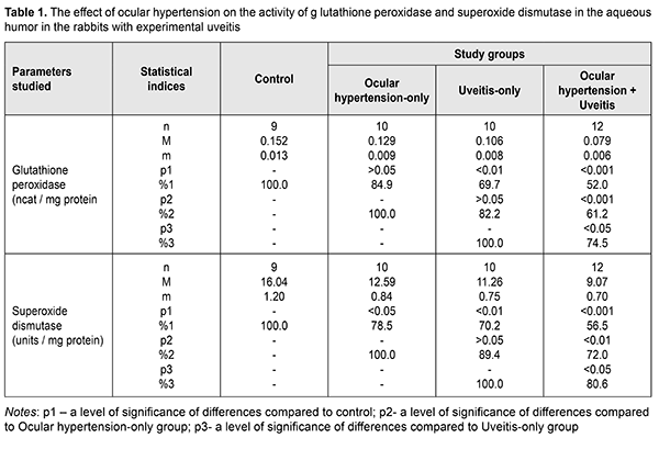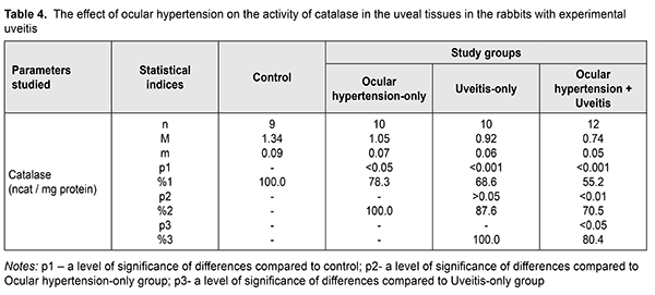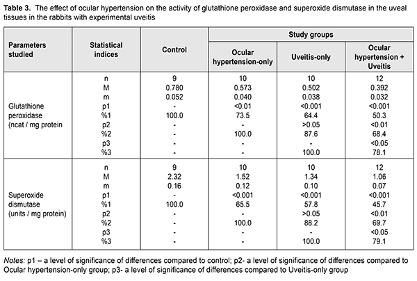 Tables 3 and 4 present the data on the effect of ocular hypertension on the activity of glutathione peroxidase, superoxide dismutase and catalase in the uveal tissues in allergic uveitis, revealing more pronounced changes in the antioxidant enzyme activity compared to those in the aqueous tissues. The glutathione peroxidase activity was decreased in ocular hypertension-only, uveitis-only, and ocular hypertension+uveitis, compared with control, by 26.5% (р<0.01), 35.6% (р<0.001), and 49.7% (р<0.001), respectively.