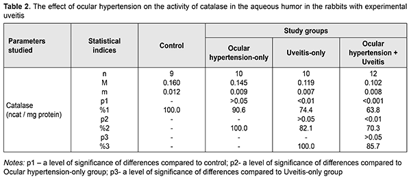 The superoxide dismutase activity in the aqueous humor in the rabbits with ocular hypertension-only and uveitis-only decreased, compared with control, by 21.5% (р<0.05) and 29.8% (р<0.01), respectively. In the ocular hypertension and uveitis rabbits, the superoxide dismutase activity in the aqueous humor decreased significantly: by 43.5% (р<0.001) compared with control and by 28% (р<0.01) and 19.4% (р<0.05) compared with the rates with ocular hypertension-only and uveitis-only, respectively. The data on the activity of catalase in the aqueous humor of the experimental rabbits with ocular hypertension and uveitis are given in Table 2. The catalase activity in the aqueous humor tended to decrease, however, not significantly, in ocular hypertension-only and decreased significantly, by 25.6% (р<0.01), in uveitis-only as compared with control. The decreased catalase activity was noted in the experimental rabbits with both ocular hypertension and uveitis as compared to control, ocular hypertension-only, and uveitis-only: by 36.2% (р<0.001), 29.7% (р<0.001), and14.3% (р>0.05), respectively.