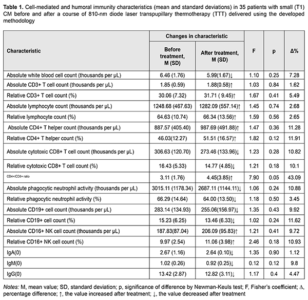 Background: Immune response is an important factor for efficacy of choroidal melanoma (CM) treatment. Adequate uveal melanoma (UM) organ-saving treatment and treatment efficacy monitoring requires determining the interaction pattern between immune and tumor cells. Purpose: To investigate changes in immune characteristics in patients with small T1 CM (measuring ? 3 mm in thickness and ? 12 mm in basal dimension) after a course of 810-nm diode laser transpupillary thermotherapy (TTT) delivered using the developed methodology. Materials and Methods: We determined immune system characteristics in 35 patients (9 men (25.7%) and 26 women (24.3%); mean age, 53.9 (12.1) years) with small (T1) CM before and after a course of 810-nm diode laser TTT delivered using the developed methodology. Results: Some characteristics (absolute white blood cell count, absolute and relative CD8+ T cell counts, absolute and relative phagocytic neutrophil activity, absolute and relative CD19+ B cell counts, IgA, IgM, and IgG) decreased, whereas others (relative white blood cell count, absolute and relative CD3+ T cell counts, absolute and relative CD4+ T helper counts, CD4+/CD8+ T-cell ratio, and absolute and relative CD16+ NK cell counts) increased after treatment. However, these changes were not statistically significant, excepting that relating to CD4+/CD8+ T-cell ratio (F=7.9; p = 0.05). Conclusion: 810-nm diode laser transpupillary thermotherapy (TTT) delivered using the developed methodology results in a shift in specific antitumor immune response patterns with a suppression of cytolytic CD8+ T cell response, which requires administering immunocorrective therapy as early as the initial stage of the disease. Keywords: small T1 choroidal melanoma, transpupillary thermotherapy, cell-mediated and humoral immunity