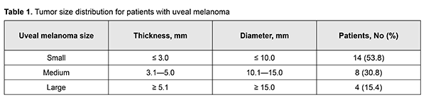 Introduction In 1583, a German itinerant barber-surgeon, George Bartisch, was the first to describe uveal melanoma (UM) [1]. A French doctor and anatomist, Ren?-Th?ophile-Hyacinthe Laennec, coined the term melanoma and provided a more detailed description of the clinical entity in 1819 [1]. Uveal melanoma is a slowly progressive primary choroidal malignancy of neuroectodermal origin [2, 3]; it is one of the most common primary malignant intraocular tumors in adults [4]. In addition, it is the second most common melanoma in adults after skin melanoma [3, 4]. Uveal melanoma accounts for about 12-15% of all melanoma cases and 85-90% of all intraocular neoplasm cases [4], and 10-year mortality rate increases with age [5]. In Europe, standardized incidence rates were found to increase from south to north across registries, from a minimum of <2 per million in registries of Spain and southern Italy up to >8 per million in Norway and Denmark [5]. Incidence rates are highest at ages 50 to 60 [2, 3]. The disease is somewhat more common among women than men, by a ratio of approximately 1.32:1 [4]. Unilateral uveal melanoma is far more common than bilateral [2, 4]. Since conventional diagnostic techniques for UM fail to provide convincing evidence related to the location, nature of growth pattern, and cancerous growth from the eye, modern diagnostic imaging modalities (e.g., computed tomography (CT) and magnetic resonance imaging (MRI)) [2, 4, 6] should be used for this purpose. Advances in radiation treatment contributed to the introduction of stereotactic radiosurgery (SRS) into clinical practice, allowing for organ-preserving treatment strategies in patients with different stages of UM [7-10]. Since research has shown SRS treatment for UM with a protrusion measuring 10-12 mm (and even more in some cases) to be at least as beneficial as enucleation with regard to metastasis rate and survival rate [9, 10], SRS treatment is commonly performed in these cases. The purpose of this study was to assess the potential of diagnostic imaging methods, computed tomography (CT) and magnetic resonance imaging (MRI), for the monitoring of SRS treatment outcomes for UM. Material and Methods Twenty-six patients with UM (age, 27 years to 68 years; mean age, 53.4±11.8 years) were involved in this study and underwent an examination. The uveal melanomas were classified as per the classification system by Shields [5] (Table 1).