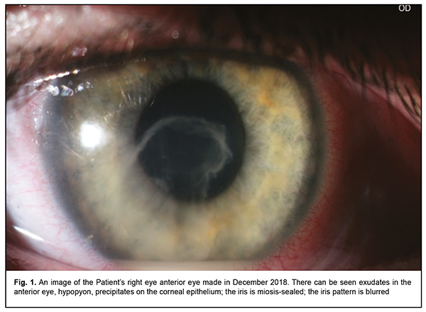 In June 2018, the Patient had tonsillitis; three weeks later, in July, the patient started complaining of photophobia, eye-watering, impaired vision, and pain in both eyes. At the place of residence, she was diagnosed with iridocyclitis and prescribed a two-week course of standard anti-inflammatory therapy. Treatment made it possible to jugulate iridocyclitis in both eyes.