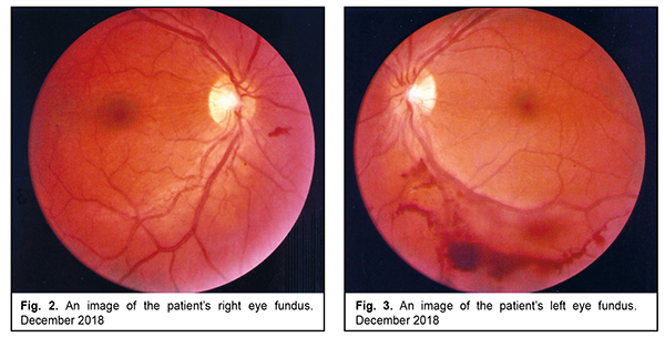 The follow-up visit at the place of residence was in November 2018. The patient with recurrent chronic iridocyclitis in the right eye was referred to the Filatov Institute of Eye Diseases and Tissue Therapy where she was diagnosed with chronic iridocyclitis with ocular hypertension (an acute stage in the right eye; unstable remission in the left eye). Retinal vasculitis was in both eyes.