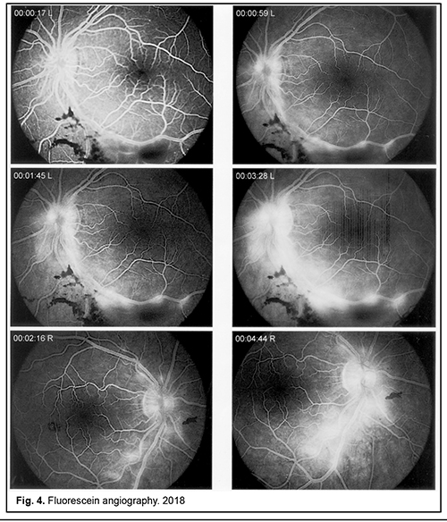 The patient was performed FAG (Fig. 4), which showed that: the right eye had the optic disc with no abnormalities; there could be seen arterial tortuosity and side-wall permeation in both superior and anterior branches of the central retinal vein, moniliform dilation of arteries, exudation along the veins, and hemorrhages outwards from the optic disc. Reflexes were blurred in the macular area.