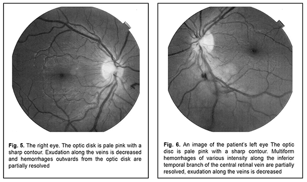 The left eye had the pale pink optic disc with sharp contours; multiform hemorrhages were partially resolved along the inferior temporal branch of the central retinal vein; exudation along the vessels decreased (Fig. 6).