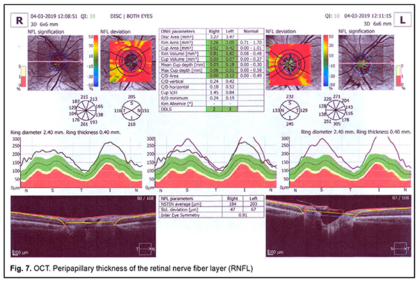 OCT revealed several structural changes as well. Nevertheless, it is important to bear in mind that the presence of uveitis is the major interfering factor when assessing the retinal nerve fiber layer (RNFL) thickness. Thus, mean RNFL values were 184 µm and 203 µm in the right and left eyes, respectively, (Fig. 7). D. B. Moore and colleagues have reported on the significantly thickened RNFL in patients with active uveitis, which is associated with the breakdown of the blood-retinal barrier and increased production of prostaglandin analogs [5. 11]. RNFL measurements can make it easier to detect signs of damage before the optic disc and the visual field are altered and, consequently, determine a subgroup which requires more active treatment [11]. When inflammation remits, the retinal thickness decreases with a reduction of RNFL thickness, which is consistent with our patient’s findings. Thus, after 4 months, the mean RNFL was 163 µm and 172 µm in the right and left eyes, respectively.
