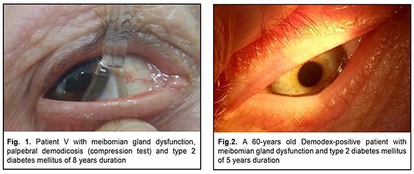 Identifying etiopathogenetic relationships of altered lipid metabolism and meibomian gland dysfunction with the development of dry eye disease is of primary importance for effective treatment and improved quality of life of patients with diabetes mellitus. Although a variety of disease-specific and symptomatic medications are available, available treatments of palpebral demodicosis are still insufficiently effective. This is contributed to by a long therapy duration, noncompliance with hygiene requirements and treatment regimens, administration of symptomatic non-acaricidal medications, absence of adequate treatment for the chronic disease, and the requirement for comprehensive treatment (palpebral demodicosis should be treated by the ophthalmologist, while face skin demodicosis, by the dermatologist) [21].