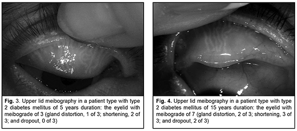Results: Palpebral demodicosis was twice as common in patients with T2DM duration more than 10 years as in those with T2DM duration less than 10 years (p = 0.002). Our meibography study found changes in meibomian glands in 90% of diabetics with palpebral demodicosis, with the mean meibograde score of 5.0 ± 0.9 points, which indicated a predominance of moderate MGD.
