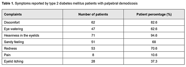 Of the 75 study patients with T2DM, 46 (61.3%) were found to have palpebral demodicosis. The major complaints were ocular discomfort, eye watering, heaviness in the eyelids, sandy feeling, redness, ocular pain, and itching. The commonest complaint was heaviness in the eyelids (94.6%), followed by ocular discomfort (82.6%), periodic redness, mostly in the evening (70.6%), sandy feeling (68%) and eye watering (62.6%) (Table 1).