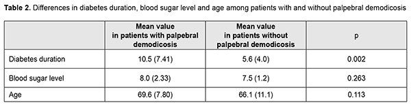 Palpebral demodicosis was twice as common in patients with T2DM duration more than 10 years as in those with diabetes duration less than 10 years (Table 2). Diabetes duration was statistically significantly longer in diabetics with palpebral demodicosis than in those without palpebral demodicosis (p = 0.002). Thus, mean diabetes duration was 10.5 years and 5.6 years for patients with palpebral demodicosis and those without palpebral demodicosis, respectively.