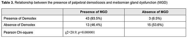 There was a statistically significant association between the presence of palpebral demodicosis and the presence of MGD (?2=20.9; р=0.000001). Thus, MGD was found in 93.5% of diabetics with diagnosed palpebral demodicosis, and only in 46.4% of those without palpebral demodicosis.
