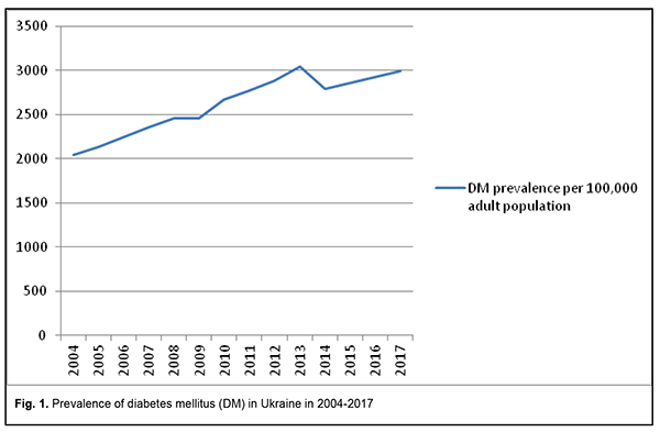 Introduction Diabetes mellitus (DM) is a global epidemic with significant morbidity and mortality. According to reports from the WHO, patients with DM have a mortality ranging from 2- to 3-fold higher, and a significantly shorter life span compared to general population. In addition, DM is among the three diseases with the highest risk of disability and mortality. An estimated 425 million adults had diabetes worldwide in 2017. This number increases annually by 5% to 7%, doubles every 12 to 15 years, and is predicted to rise to 642 million (about 10% of the world’s population) by 2040. The Ministry of Health of Ukraine estimates that, at this time, there are about 1.3 million of DM patients in the country, and according to the International Diabetes Federation Atlas, the number of people living with DM in Ukraine exceeds 2.8 million [1, 2, 3]. The current medical armamentarium against DM is sufficient to enable an active life style for patients and to extend their life. However, the main cause of disability and mortality in patients with DM is not the disease itself but its complications, which represent a generalized vascular injury resulting in persistent metabolic defects and thus leading to neuropathy, nephropathy, and retinopathy [4, 5, 6]. Diabetic retinopathy (DR) is a common microvascular complication of DM and a leading cause of blindness for adults aged 20-74 in industrialized countries. It is found in 35.4%, and proliferative disease, in 7.5% of patients with DM. Annually, approximately 700 thousand patients with DM over the world lose their vision. The proportion of global blindness caused by diabetic retinopathy was 2.6% in 2010 [7]. Compared to healthy individuals, patients with DM have a 25-fold higher risk of blindness. In addition, approximately 10% of patients with DM have visual disability. Proliferative DR is the severest form of diabetic eye disease leading to visual disability and develops in 3.5% of DM patients who have diabetes for less than 10 years, 20-30% of those who have diabetes for 10 to 15 years, and 60% who have diabetes for 20 to 30 years [8]. Patients with apparent DR have low quality of life and low scores of physical, emotional and social well being. According to the Diabetic Retinopathy Barometer Report, 79% of respondents said their vision impairment due to DR or DME made everyday activities difficult, such as driving, working and cooking or cleaning their home, and in some cases impossible, and 20% of respondents said their vision impairment due to DR or DME made it difficult to manage their diabetes [9]. Given that rates of diabetes and its disability-related complications (including those leading to visual impairment or blindness) are increasing rapidly worldwide, making a current analysis of the epidemiological situation regarding DM-induced visual disability in Ukraine is deemed important. The purpose of the study was to investigate the rates of disability due to ocular complications of diabetes mellitus in Ukraine for the time period from 2004 to 2018. Specifically, we aimed to analyze data on the prevalence and severity of DR-induced visual disability, the proportion of the overall visual disability attributable to DR, and changes in these characteristics over time. Material and Methods The following information sources were used to investigate the epidemiological data: statistical reports issued by relevant Medico-Social Expert Commissions (MSECs) based on assessment and examination of patients with eye problems in Kyiv City and Kyiv Region (2004-2018), annual analytical and information booklet named “Major Indicators of Disability and Activities of MSECs (2004-2018)”, and diabetes prevalence reports for 2004 to 2017 issued by the Medical Statistics Center of the Ministry of Health of Ukraine. The previous study on this subject was conducted 15 years before, in 2004 [10]. Results and Discussion It is reasonable to investigate interrelated indices of the prevalence of DM, disability resulting from DM, and visual disability due to any cause. The prevalence of diabetes mellitus in Ukraine increased from 2,043.1 per 100,000 population in 2004 to 2,996 per 100,000 population in 2017, which reflects worldwide trends. There were 1,270,929 nationally registered individuals with diabetes mellitus in 2017, compared to 969,269 in 2004. It is noteworthy that the number of registered diabetics increased by 31%, although the registered population decreased, partially at the expense of the Autonomous Republic of Crimea and occupied territories of Donetsk and Lugansk regions (Fig. 1).