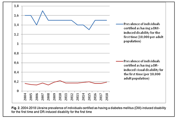 Background: Diabetes mellitus (DM) is a global epidemic. According to reports from the WHO, DM patients have a significantly shorter life span compared to general population, and DM is among the three diseases with the highest risk of disability and mortality. Purpose: To investigate the rates of disability due to ocular complications of DM in Ukraine for the time period from 2004 to 2018. Results: The prevalence of DM in Ukraine was increasing during this period. The annual prevalence of individuals certified as having a DM-induced disability for the first time was relatively stable during 2004 through 2018 and was 1.5 per 10,000 of adult population in 2018. The annual prevalence of individuals certified as having a diabetic retinopathy (DR)-induced visual disability for the first time per 10,000 of adult population was 0.19 in 2018, and varied substantially during the period from 2004 to 2018, with a minimum of 0.13 in 2006 and 2015, maximal values of 0.22 and 0.20 in 2010 and 2015, respectively, and a general tendency to increase. During the period, changes in the prevalence of DR-induced disability varied among Ukrainian regions differing in geographical aspects. The proportion of blind and visually impaired (i.e., severely and moderately disabled, respectively) among individuals certified as having a DR-induced visual disability was higher than that among total individuals certified as having a visual disability for the first time; this indicates that the pathology is severe. The level of accumulated disability due to ophthalmic diabetes in Ukraine increased almost 2.5-fold during the last 15 years. Keywords: diabetes mellitus, diabetic retinopathy, blindness, disability