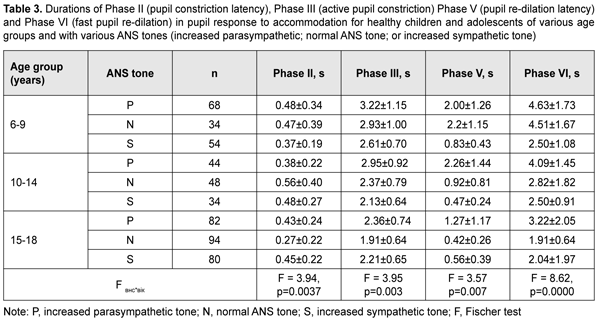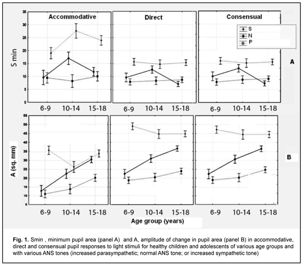 Introduction Accommodation is the ability of the eye to adjust its refractive power to keep an object in focus at various distances [1]. The mechanism of accommodation is implemented through a number of structural-and-functional components (the crystalline lens, ciliary muscle, and choroid) which are controlled by the sympathetic and parasympathetic compartments of the autonomic nervous system (ANS) in the process of accommodation. Accommodation is closely associated with pupil response; both of them are components of the unconditioned reflex which is implemented through the activity of the accommodative and convergence system. The system provides simultaneous achievement of best-corrected visual acuity, binocular vision, and correct position of the eyes focused on objects at any distance. Provision of increased focus for near vision is the main function of pupillary response which is a component of accommodative and convergence reflex, and is expressed through pupillary constriction that occurs when a person changes his gaze from far to near [1, 2, 3]. Knowledge of the state and response of the pupillary system is very important for determining a variety of the disorders of the visual system, ANS and central nervous system (CNS). That is why pupillometry as an objective research technique is used to (1) diagnose conditions and disorders of the CNS, (2) identify functional impairments in persons with eye pathology, including glaucoma, diabetic retinopathy, pigmented retinitis, retinitis pigmentosa, strabismus, and amblyopia, and (3) assess individual’s capacity for visual work, etc. [4-14]. As there is close association between pupil response and accommodation during gaze fixation on an object at any distance, it is important to assess accommodative pupil response both in healthy children and in those with accommodative disorders. The prevalence of the latter was 3.68 per 1000 children aged under 6 years, 35.57 per 1000 children aged 7–14 years, and 84.86 per 1000 children aged 15–17 years in Ukraine in 2018 [15]. It is also important to assess relationships of characteristics of pupil response to accommodation and convergence with age and ANS tone. It is hypothesized that pupillography parameters can be regarded as objective criteria for assessing pupil response to accommodation and convergence, and serve as an important consideration in choosing the treatment method in patients with accommodative disorders. The purpose of the first stage of this study was to determine normative pupillography values. The purpose of the study was to assess pupil response to accommodation and convergence in healthy children and adolescents of various age groups and autonomic nervous system tones. Material and Methods Pupil response to accommodation was studied in 269 healthy children and adolescents (538 eyes) aged 6 to 18 years. All study subjects were systemically and ocularly healthy. Eye examination showed that children and adolescents had central eye fixation, binocular vision, mean visual acuity for near and distance of 1.02±0.02, and no pathological changes in the anterior eye, optic media or fundus. Refractive error was normal for age, and mean corneal refractive power was 42.83 ± 0.10 D. The mean axial length as measured by ultrasound biometry was 23.4±0.25 mm. Subjects were divided into three groups based on their age: group 1 (6-9 years; 77 subjects), group 2 (10-14 years; 96 subjects), and group 3 (15-18 years; 96 subjects). Group age ranges were selected based on previously reported findings on changes in the balance of autonomic pupil innervation in ontogenesis. Thus, Velkhover and colleagues [4] found that, in children, mydriasis begins progressing at the age of 2 months of their life, and this progression continues for 10 years at average, indicating that the sympathetic ANS develops at a higher rate than the parasympathetic ANS. Approximately at the age of 10-14 years, the sympathetic ANS activity approaches its maximum, and an approximate balance is achieved in reciprocal interaction between cholinergic (parasympathetic) and adrenergic (sympathetic) components of ANS innervation of the sphincter, and, probably, accommodative muscle [4, 5]. Subsequently, the activity of the parasympathetic component increases, approaching its maximum by 20-24 years of age. ANS tone was assessed using the ANS dysfunction questionnaire designed by Vein and the Kerdo index (KI) [16]. The subjects completed the questionnaire by answering either “Yes” of “No” to the questions regarding the function of their ANS, and a total score was computed by summing all positive answers. The total score for healthy individuals was 15 or less. The Kerdo index (KI) comprising cardiovascular characteristics, blood pressure and cardiac frequency (or heart rate, beats/min), was used to determine whether sympathetic or parasympathetic ANS tone was apparent [16]. This study was performed with the patient sitting; heart rate (beats/min) was measured at the radial artery, and blood pressure measurements (mmHg) were performed in a standard manner. Kerdo index (KI) was calculated with the following formula: