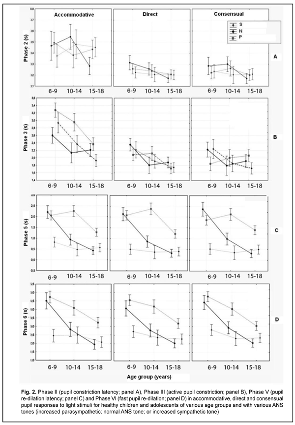 Discussion This study for the first time reports the following normative indices of pupil response to accommodation and convergence which characterize pupil area and change in pupil area in strained accommodation for healthy children and adolescents of various age groups (6-9, 10-14 and 15-18 years) and ANS tones: maximum pupil area (Smax), minimum pupil area (Smin), amplitude of change in pupil area (A), and duration of phases of change in pupil size (Phase II, pupil constriction latency; Phase III, active pupil constriction; Phase V, pupil re-dilation latency; and Phase VI, fast pupil re-dilation). Previously, most studies have focused on assessment of static pupillography indices such as pupil diameter and pupil area. There is a limited number of studies focusing on dynamic pupillography parameters [4, 5, 21-23], however, without consideration of the balance of autonomic innervation. There is, however, an opinion that some dynamic pupillography parameters (e.g., pupil constriction velocity) depend on the balance between sympathetic and parasympathetic tones. When there is such a balance, an increased sympathetic tone decreases the pupil constriction velocity, whereas an increased parasympathetic tone decreases the velocity. Velkhover and colleagues [4, 5] measured pupil area in healthy individuals aged from birth to 80 years, and found that mean pupil area in the 6-9, 10-14, and 15-19 years age groups was 19.2 ± 0.29 mm2, 19.7 ± 0.29 mm2, and 16.46 ± 0.27 mm2, respectively. They explained such a pattern of pupil area value distribution by the features of ANS development in ontogenesis: before 10-14 years of age, the sympathetic component develops significantly faster than the parasympathetic component. At 10-14 years of age, sympathetic component activity achieves its maximum, with some balance between the two components. Thereafter and until 20-24 years of age, the activity of the parasympathetic component increases. Those authors, however, did not assess the relationship of pupil area with the balance of autonomic innervation. Others [24-27] not only reported that age is a factor significantly influencing pupil characteristics, but also demonstrated that pupil size tends to decrease with age. There is a limited number of studies [13, 28, 29] focusing on age-related changes in pupil response, including velocity of constriction and subsequent dilation of the pupil. Thus, Tekin and colleagues [29] demonstrated that resting diameter, velocity of pupil contraction, and velocity of pupil dilation values were inversely and moderately correlated with age (p < 0.001, r = -0.63; p < 0.001, r = -0.47; and p < 0.001, r = -0.34, respectively), whereas latency of pupil contraction was positively and moderately correlated with age (p = 0.002, r = 0.29) in healthy individuals aged 6 to 70 years. Volkova [30] has noted the effect of autonomic nervous system tone on pupil diameter and found that emmetropes with an increased sympathetic tone exhibited larger pupil diameter (5.17 mm) than those with normal ANS tone (4.33 mm) or those with an increased sympathetic tone (4.08 mm), which is confirmed by our findings. That author, however, did not report on pupil size for different age groups. In the current study, the absolute value of amplitude of change in pupil area was substantially less in accommodative and convergence pupil response than in direct or consensual pupil response. The mean normalized value of amplitude of change in pupil area clearly tended to be less in accommodative pupil response (48.9% to 66% in various age groups) than in pupil response to light stimulus (67.1%-83.6%), which indicated that (1) a pupil excursion in the former response is less than in the latter response, and (2) these two types of pupil response are definitely formed by the mechanisms differing from each other. We found no significant relationship between the normalized value of amplitude of change in pupil area and the age or balance of autonomic innervation. Our findings are similar to those reported by Tekin et al [29], who also found no significant effect of age on the amplitude of pupil contraction presented in percentage of the baseline pupil diameter. Overall, in the current study, there was a similarity between direct and consensual pupil response in terms of all examined parameters, but the was a significant difference between accommodative response and direct or consensual pupil response in terms of the amplitude of change in pupil area (A) and duration of Phase II (pupil constriction latency) and Phase III (active pupil constriction); these phases were substantially longer in accommodative response than in direct or consensual pupil response. The revealed differences may indicate that pupil contraction mechanisms in accommodation and light stimulation of the pupil differ from each other. Our findings somewhat correspond to those reported by Math?t S. [23], with Phase II (pupil constriction latency) and Phase III (active pupil constriction) being substantially longer in accommodative pupil response (0.6 s and 0.6 s – 2 s, respectively) than in pupil response to light stimuli (0.2 s and 0.2 s – 1.5 s, respectively). That author, however, did not report on pupil constriction latency values for various age groups, and noted that the pupil near response (i.e., accommodative response) “is certainly the least studied, and perhaps the least understood of all pupil responses” [23]. Provision of increased focus for near vision is the main function of the accommodative pupil response which is a component of the accommodation and convergence reflex. It has been reported that the neural basis of the pupil response to accommodation is somewhat different from that of the pupil response to light stimuli, which may explain a difference in values of pupillography indices between these two responses. In particular, unlike the pupil light response, the pupil near response does not appear to be driven directly by a