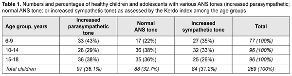 where D is diastolic blood pressure (mmHg) and P is heart rate (beats/min). The Kerdo index value was used to make a conclusion on the balance of sympathetic and parasympathetic effects on the cardiovascular system. KI equals zero in normal autonomic nervous system tone, is negative in individuals with an increased parasympathetic tone, and positive in those with an increased sympathetic tone of the autonomic nervous system. Pupillography studies were performed using an OK-2 pupillographer (Ukraine) developed by the Filatov institute in cooperation with Om-Tekhnologiia (Odesa, Ukraine) [17]. Pupillometry studies of pupil response to accommodation and convergence were conducted using our methodology reported previously [17, 18]. Data were obtained in a dark clinic room throughout 9:00 AM – 11:00 AM. In brief, each subject was adapted to a background illumination (10 lux; 15 minutes) and instructed regarding the pupillometry procedure prior to the start of the study session. Thereafter, he had a headpiece with IR video cameras put on, and the video recording was switched on. During video recording of pupil response to accommodation, a background illumination was 10 lux. The subject fixed his eyes on a test object located at a distance of 100 cm (relaxed accommodation and convergence), and shifted his gaze to a test object located at a distance of 10 cm (strained accommodation and convergence). Video recording data were processed by software to produce a plot of changes in the pupil area for both eyes for the study protocol. In addition, direct and consensual pupil responses to light stimuli (50 lux light intensity; 12 s duration) at a background illumination of 10 lux were studied to compare pupillography indices for various types of pupil responses. The following pupil response characteristics were subjected to analysis: maximum pupil area (Smax, under relaxed accommodation), minimum pupil area (Smin, pupil constriction under strained accommodation or due to light effect), amplitude of change in pupil area (A), and duration of phases of change in pupil area (Phase II, pupil constriction latency; Phase III, active pupil constriction; Phase V, pupil re-dilation latency; and Phase VI, fast pupil re-dilation). Statistical analyses were conducted using Statistica 8 (StatSoft, Tulsa, OK, USA) and Microsoft Excel 2007 software. Mean values, standard deviations (SD), and their 95% confidence intervals and significance values (p) were calculated. A two-way analysis of variance and Fischer’s F-test were used to determine the effect of the age and state of the ANS on pupillography indices. The level of significance p < 0.05 was assumed. The non-parametric Spearmen test was used to calculate correlation coefficients; these were considered significant at p < 0.05 [19, 20]. Results At baseline, ANS balance was assessed using the Kerdo index. In children of 6-9 years, increased parasympathetic tone was the most common (43%), followed by increased sympathetic tone (35%) and normal ANS tone (22%). In children of 10-14 years, normal ANS tone was the most common (38%) followed by increased sympathetic tone (33%) and increased parasympathetic tone (38%). In adolescents of 15-18 years, increased parasympathetic tone was the most common (38%), followed by normal ANS tone (36%) and increased sympathetic tone (26%) (Table 1).