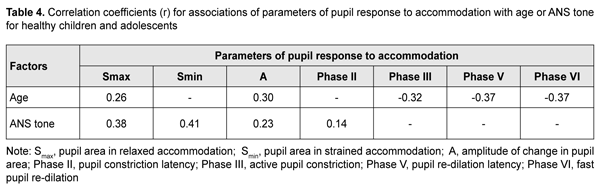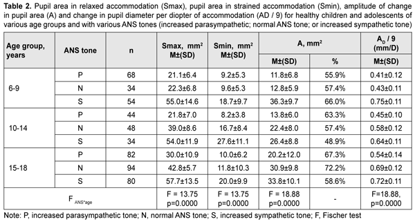 Table 2 presents values of pupil areas in accommodative pupil response for children of various ages and ANS tone. With a test object located at a distance of 100 cm, maximum pupil area (Smax) under relaxed accommodation significantly depended on the child’s age and ANS tone (F=13.75, p=0.0000). The greatest Smax values were found for children with increased sympathetic tone, and the lowest, for those with increased parasympathetic tone (p < 0.001). It should be noted with regard to distribution of Smax values that Smax did not depend on the age, with the mean value being 55.6 ± 13.3 mm2. In addition, among children with normal ANS tone, the Smax gradually increased with the age, from 22.3 ± 6.8 mm2 for children aged 6-9 years, to 39.0 ± 8.6 mm2 and 42.8 ± 5.7 mm2 for those aged 10-14 years and older 14 years, respectively. Moreover, children with increased parasympathetic tone exhibited almost equal levels of Smax, with the mean value being 25.8 ± 8.8 mm2.