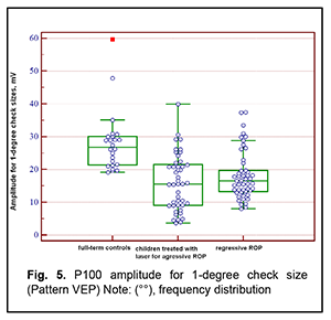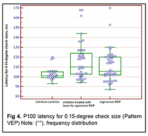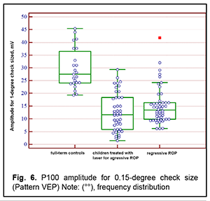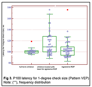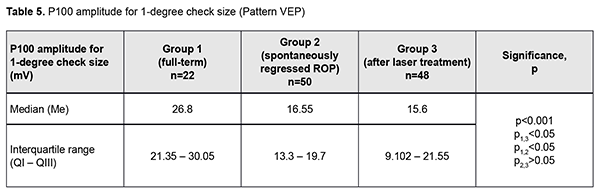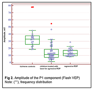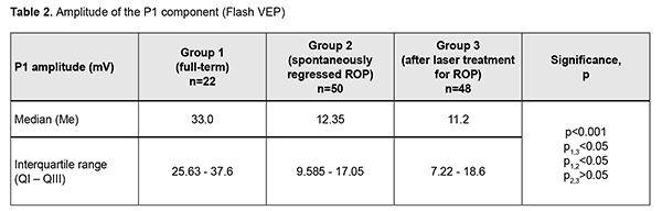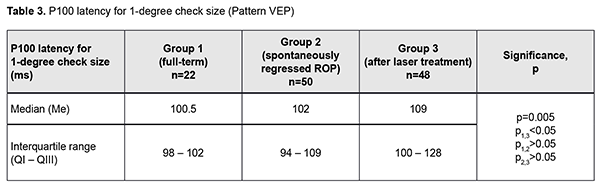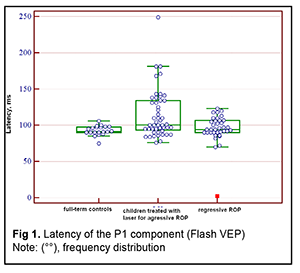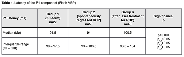 Introduction An increasing rate of successfully managed very low birth weight premature infants is a hallmark of modern medicine. In order to catch up in development with their normal peers, these children need rehabilitation targeted to the organs and systems that are not completely formed by the time of birth. The visual system is one of the most important ones affected by a serious complication of prematurity, specifically, retinopathy. Neurulation begins at day 18 of gestation. The eyes are formed within dozens of hours. The process of neurulation converts the neural plate into the neural tube and takes 10-13 days [9]. The neural tube failure to close may result in the birth of a cyclopic infant. Normally, at day 20-21 post-fertilization, a single eye field forms in the middle of the anterior neural plate, which separates into two optic vesicles. During this period, retinal ganglion cells develop from the vesicles, and the optic nerve develops from axons of retinal ganglion cells. From the eye, the optic nerve carries visual information to the lateral geniculate body, which is the primary visual centre in humans. And from there the nerve fibers that make up the optic radiation carry the visual signal to the primary visual cortex (specifically, occipital cortical areas 17, 18, and 19). The retinal ganglion cell axons form the retinal nerve fiber layer. The number of ganglion cells increases by the beginning of the 3rd month of embryo life, and the number of retinal ganglion cell fibers per eye is as high as 80,000 at 11-12 weeks’ gestational age, and about 170,000 at 4 months. However, the number decreases to 140,000 fibers per eye at 16 weeks’ gestational age, and about 117,000 fibers per eye at 6 months [9]. However, because unfavorable fetus development causes preterm delivery, it seems fair to suppose that the number of visual system neurons is rather low initially, and, subsequently, as much as 40% of visual fibers are lost due to physiological autolysis. Consequently, a rather alarming condition, retinopathy, develops in a premature infant, which frequently results in retinal detachment and blindness [9]. The electrophysiological technique of visual evoked potential (VEP) has been used since the mid-1960s to assess visual system function and maturity, and for diagnosis of injuries to the retinocortical pathway. Although the technique has been used for dozens of years, it is being actively studied because it is still the only non-invasive method capable of determining the functional integrity of the visual system. For clinical purposes, flash VEP and checkerboard pattern reversal VEP are most commonly used. Flash VEP is more variable in appearance than the pattern reversal VEP, but there is a group of patients for whom the former is sometimes the only appropriate diagnostic technique. This group includes (1) infants, (2) the children who cannot concentrate their attention and/or fix their eyes on anything for a long enough time, and (3) children with low visual acuity [8]. VEP reflects the total response of large populations of cortical neurons to the afferent stimulus-induced synchronous pulse train with a flash or reversal pattern stimulus acting as an afferent stimulus to gaze. The whole retinal surface responds to flash, and excitation passes through all optic nerve fibers. In checkerboard pattern reversal VEP, a structured stimulus excites the cones of the central and paracentral retina, and the information from area 17 of the visual cortex is subsequently processed [9]. VEP represents a polyphasic negative-and-positive oscillation. VEP components can be divided into the early (occurring within 100 ms after stimulus onset) and the late (100 ms to 300 ms after stimulus onset) components. VEP consists of specific and non-specific responses due to the existence of the two different afferent systems. In the first afferent system, pulses are transmitted via the retino-geniculo-striatal pathway. The P100 component of the VEP has the largest amplitude and a latency of about 100 ms and is thought to reflect the function of the first system. The activity of the second afferent system is associated with the activity of mesencephalic structures and non-specific thalamic nuclei which induces the onset of later VEP components [9]. The International Society for Clinical Electrophysiology of Vision (ISCEV) standard protocols has been defined for a single recording channel with a midline occipital active electrode. The purpose of this study was to assess the electrical visual system activity in full-term children versus those with retinopathy of prematurity (ROP) using flash and pattern VEPs. Material and Methods The medical records of 64 children (120 eyes) who were under observation at the polyclinic of the Filatov Institute were retrospectively reviewed. Children were divided into three groups. Group 1 involved 11 full-term controls (22 eyes; mean age, 6.3 years; mean visual acuity, 1.2). Group 2 involved 26 children (50 eyes; mean age, 6.8 years; mean beast-corrected visual acuity (BCVA), 1.0) with regressive ROP. Group 3 involved 27 children (48 eyes; mean age, 5.9 years; mean beast-corrected visual acuity (BCVA), 0.9) treated with laser for type 1 pre-threshold ROP or aggressive posterior ROP (APROP). ROP was diagnosed as per the ISCEV standard protocols. Patients of Group 3 underwent confluent laser (Purepoint Laser; Alcon, Fort Worth, TX) photocoagulation. The laser parameters were as follows: 532 nm wavelength, 120-220 mW exposure power, 100-150 ms exposure time, maximum spot size, and 100-ms pulse-to-pulse interval. Laser energy was delivered in pulse mode. The total number of laser spots per eye was as much as 4,000 to 5,000 depending on the severity and extension of pathologic changes in the fundus. This VEP study was performed using RETIscan (Roland Consult, Wiesbaden, Germany). Reference and ground electrodes were placed on the right and left earlobes, respectively, and th