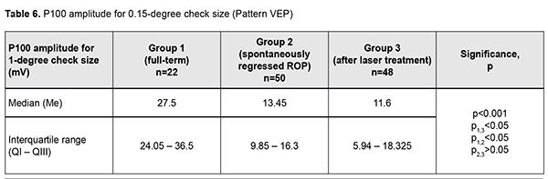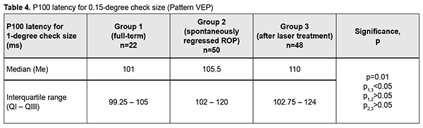 Discussion VEP is a non-invasive tool for measuring the electrical activity of the brain. Numerous researchers have studied VEP parameters in preterm infants [10] in order to obtain interpretable signals and demonstrate the sequence of the development of visual brain pathways [1, 10]. Flash VEP is sometimes the only appropriate technique for diagnosing the state of the visual system in early age children. In flash VEP, the response from the complete field of vision and bioelectrical activity of the whole visual system are determined. The technique, however, does not assess visual system domains separately. The presence of a central vision disorder cannot be excluded even if there are no changes in the visual pathway. Koshelev et al [8] reported on the use of flash VEP for the assessment of visual system function in preterm children in 2014. They noted that the technique (a) identifies the presence of vision in the early age, when assessing visual acuity using an Orlova chart is impossible; (b) allows assessing how well the visual functions are preserved after peripheral retinal laser photocoagulation (LPC); (c) allows assessing the velocity of visual signal conduction and the efficacy of visual signal processing; and (d) allows comparing the right and left monocular channels for activity and assessing binocular integration of these channels [8]. In the current study, we included three different groups (full-term infants, children with spontaneously regressed ROP, and children with aggressive posterior ROP), and made a more detailed comparative group analysis not only for fVEP P1 amplitude and latency, but also for pattern VEP (P100). In addition, as opposed to the study by Koshelev et al [8], where the subjects were children aged 3 years or younger, children included in this study were aged 5 to 8 years, and the information obtained on visual system function was more accurate. Our statistical analysis found a significant difference in amplitude and latency between groups 1 and 2 and between groups 1 and 3. In addition, there was no significant difference in any characteristic between children with spontaneously regressed ROP and children treated with laser for aggressive posterior ROP. Moreover, P100 latency was shorter in children with spontaneously regressed ROP than in full-term children. These findings are close to those of Magoon et al [7] who noted that maturation of cerebral cortex structures and formation of synaptic connections begin at 37 weeks of gestation, right after the visual pathways have been myelinated. Madan et al [3] demonstrated an improvement in VEP P100 amplitude during the period of formation of the lateral cortical connections. The short P100 latency in the preterm children has been attributed to fast maturation of the cerebral cortex and delayed myelination of visual pathways [1]. Early maturation of fVEP N1 in the preterm children has been noted previously and was attributed to early visual cortex development. In agreement with those findings, we noted that the fVEP N1 latency in the preterm children (30-45 ms) was shorter than in full-term children (45-50 ms) [5]. In addition, in the current study, the fVEP P1 latency in 5 to 8-year-old full-term children and children with spontaneously regressed ROP was within 90-94 seconds. This indicated the cerebral white matter maturation pattern for full-term children was similar to that for preterm children [5]. However, the fVEP P1 latency in children treated with laser for aggressive ROP was as long as 134 ms, which was attributed to immature structures and delayed neural conduction along visual pathways. Low fVEP P1 amplitude in children of groups 2 and 3 indicates immature visual pathways in the total preterm group [4]. Kogoleva [7] used pattern VEP topographic mapping to find long P100 latency in 3 of 18 eyes with stage 1 ROP, 9 of 41 eyes with stage 2 or 3 ROP, and 10 of 53 eyes with stage 4 or 5 ROP. Therefore, there was no strong correlation between P100 latency and stage of ROP. Faizullinа and colleagues [10] found abnormal visual pathway function in 72.9% of one-year-old children with cicatricial ROP, the most common abnormalities being low functional activity of visual structures (28.7%) and abnormal optic nerve function (20.1%). In addition, abnormal optic nerve function was 3.6 times more common in infants after panretinal LPC than in those after focal LPC (47.3% vs 13.1%). This is in agreement with our findings for children who underwent confluent LPC for aggressive ROP. The literature and our findings suggest that P1 amplitude and P100 amplitude decrease with increased disease severity. We, however, found no significant correlation between P1 latency or P100 latency and severity of ROP. Our findings of long latency and low amplitude of Р100 and Р1 point to the likelihood of pathway abnormalities and/or partial optic nerve atrophy in preterm children with ROP. However, the activity of primary visual centers of the occipital lobes was found to be still prevailing, which was confirmed by the absence of severe central retinal changes. In severe ROP, long Р100 latencies and low Р100 amplitudes, long Р1 latencies and low Р1 amplitudes, along with changes in morphometric changes in the optic disc (increased maximum elevation and depression of the contour line) indicate optic disc traction and dysfunction of the papillomacular bundle [4]. In addition, long Р100 latencies and low Р100 amplitudes and long Р1 latencies and low Р1 amplitudes in children with ROP indicate that there is a combination of visual abnormalities due to not only the severity of ROP, but also due to concomitant disorders of the visual pathways and occipital lobes of the cerebral cortex. Employment of different types of VEP improves the potential for assessment of the state and site of damage to the visual pathway, prediction of changes in visual acuity, selection of medical rehabilitation strategy. Conclusion First, latencies and a