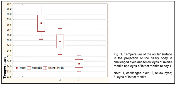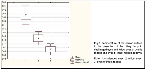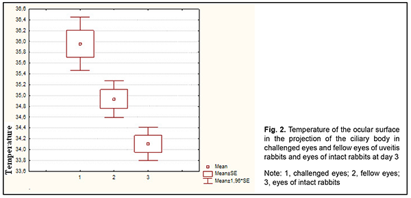 At day 3, temperature of the ocular surface in the projection of the ciliary body for the challenged eye was 36.0°С (0.7), and for the fellow eye, 34.9°С (0.5), but the difference was not significant (р = 0.09). In addition, the difference in temperature of the ocular surface in the projection of the ciliary body between challenged eyes and eyes of intact rabbits was significant (р=0.002), whereas that between fellow eyes and eyes of intact rabbits was not (р=0.17), which may indicate a tendency toward a decrease in temperature for the fellow eye (Fig. 2).