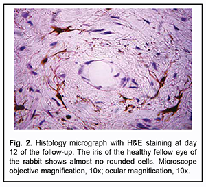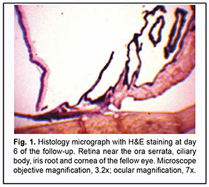 Introduction Although uveitis can be classified as a rare (orphan) disease, it is the fourth most common cause of visual disability in developing countries [1-5]. It is important to use objective methods for assessing intraocular inflammation in the practical management of uveitis. Unfortunately, today laser flare photometry is the only available objective method of determining the activity and degree of inflammation. The laser flare meter has been introduced for quantification of anterior chamber protein and cells, which allows detecting even subclinical inflammation. The technique is employed both for disease diagnosis and monitoring [6-10]. Laser flare photometry is most useful in anterior uveitis. However, in intermediate uveitis, this tool is less reliable than in anterior uveitis and has certain limitations. In addition, cataract, corneal opacities, pupil size, intraocular lens and shallow anterior chamber can affect the results of laser flare-cell photometry [11]. We have given attention to studies on local body temperature responses as a potential alternative method for quantitative assessment of intraocular inflammation. Studies on the basis of local body temperature measurements have been already widely used in various medical specialities like neurology, vertebrology, orthopedics, oncology, phlebology, gastroenterology, endocrinology, sports medicine, traumatology, heart surgery, otorhinolaryngology, dentistry, etc. [12-25]. We believe it is reasonable to conduct a preclinical animal study on local body temperature measurements in uveitis, in an attempt to compare temperature data not only with the clinical picture but also with the results of morphological studies reflecting the actual status of intraocular inflammation. Previously, we have found that the pattern of heat exchange in intact rabbit’s ocular surface (temperature of the ocular surface in the projection of the ciliary body is influenced by autonomic thermoregulation and is relatively stable at small environmental temperature variations) allows for modeling of unilateral ocular pathological processes that would have a change in local body temperature in the projection of the ciliary body as an objective marker [26]. On day 1 of induced non-infectious anterior and intermediate uveitis in rabbits, the temperature in ciliary body projection onto the ocular surface increased to 35.7°С (р = 0.002) for the challenged eyes and to 35.0°С (р=0.05) for the fellow eyes compared to eyes of intact rabbits, which was likely to be caused by the response of the autonomic nervous system in the presence of initiation of inflammatory process. On day 5, a less significant difference appeared in the ocular surface temperature between the challenged eyes and fellow eyes, which was likely to be caused by decreased temperature response of the autonomic nervous system as well as by a gradual decrease in temperature of the fellow eye [27]. Consequently, we decided to conduct a histological study of the healthy fellow eye in these animals to definitely rule out sympathetic ophthalmia as a possible cause of such an increase in temperature. Therefore, the purpose of this study was to assess the histomorphology of the healthy fellow eye in rabbits with unilaterally induced non-infectious anterior and intermediate uveitis. Material and Methods Seventeen Chinchilla rabbits (34 eyes; weight, 2.5-3.0 kg) were included in this study. They were divided into two experimental series, series 1 (7 rabbits) and series 2 (10 rabbits). Animals were used in the experiments after being quarantined for 2 weeks. They were housed at the normal vivarium temperature of 18 до 25°С, and fed and watered conventionally. All animal experiments were performed in compliance with the Law of Ukraine on Protection of Animals from Cruel Treatment No. 3447-IV dated 21.02.2006 and European Convention for the Protection of Vertebrate Animals Used for Experimental and Other Scientific Purposes from the European Treaty Series (Strasbourg, 1986), and approved by a local Bioethics Committee of the Filatov Institute. Non-infectious anterior or intermediate uveitis was induced in the right eye of each rabbit, while the left was intact. The methodology used for inducing uveitis in animals has been described previously [27]. Follow-up duration ranged from 6 to 57 days. Based on the experimental protocols, animals were euthanized either after ophthalmoscopical resolution of symptoms of active uveitis (1-2 weeks after challenge) or after the temperature difference between the uveitic eye and the fellow eye decreased to a maximum of 0.2°С at consecutive time points of the follow. Animals were euthanized by intravenous injection of thiopental sodium (50 mg/kg). Thereafter, enucleated eyes were fixated in 10% formalin, embedded in paraffin, cut into 5-?m sections, stained with hematoxylin and eosin, and sent for examination of histomorphological features under the light microscope. Histomorphological studies were conducted at the Pathology and Electronic Microscopy Laboratory of the Filatov Institute. Images were captured at various magnifications using a PowerShot A480 camera (Canon Inc., Tokyo, Japan) attached to a Laboval 4 light microscope (Carl Zeiss, Jena, Germany). Results Histologically, the fellow eye enucleated on day 6 was of a normal structure typical for a healthy rabbit eye. This was true for all the anterior eye structures (the cornea, iris and ciliary body) and the posterior segment. No pathological change was observed in the choroid, vitreous or retina of the fellow eye at the end of day 6 after unilateral intravitreal challenge (Fig. 1).