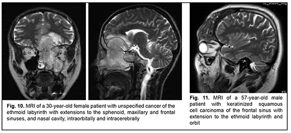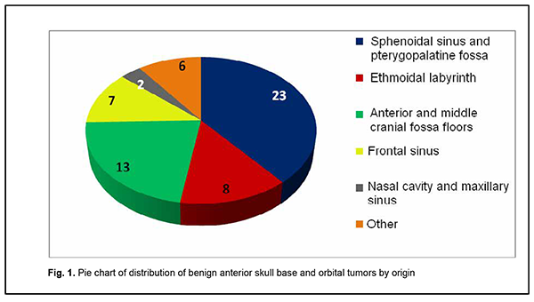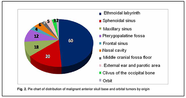 Introduction Tumors of the anterior skull base and orbit (ASBOT) extend intra- and/or extracranially, and invade the face, orbit, nasal cavity, paranasal sinuses, naso- and oropharynx, maxilla, neck, ear, infratemporal and pterygopalatine fossae, and facial bones, with damage to the skull base (anterior and lateral neurocranium and posterior cranial fossa), and penetrate to the intracranial space. Commonly, these are epithelial neoplasms (cancers). They may be cartilaginous or osseous tumors (chordoma, chondrosarcoma, osteosarcoma, osteoblastoma), vascular tumors (angioleiomyoma, hemangiosarcoma, hemangiopericytoma), connective tissue tumors (leiosarcoma, rhabdomyosarcoma, neurofibrosarcoma, neuroblastoma, reticulosarcoma), and neuroepithelial tumors (schwannoma, esthesioneuroblastoma). Juvenile nasopharyngeal angiofibromas (skull base angiofibromas), meningiomas, and intracranial osteomas which may extend extracranially are common among benign ASBOT. The nasal cavity is the most common location for malignant ASBOT (44%), followed by sinus maxillaries (36%), other paranasal sinuses (15%) and orbit (5%) [1]. Approximately 25%-30% of ASBOT are diagnosed in advanced cases. Five-year survival rate for malignant nasal cavity tumors and paranasal sinus tumors with growth into the orbit and/or skull cavity was not more than 16% until 1986, and was increasing thereafter to a value as high as approximately 60% due advances in craniofacial resection. Early morphological diagnosis of the tumor and adequate radical surgical intervention are essential and associated with tumor dissemination within the paranasal sinus region, orbit, skull base, intracerebrally, and into the cavernous sinus [2-5]. Primary epithelial tumors of the orbit are located in the lacrimal gland area (PELGT), and commonly grow invasively with destruction of the roof and external floor of the orbit and intracranial and intracerebral extensions, which is the main cause of mortality [6, 7-12]. Currently, computer tomography (CT) and magnetic resonance imaging (MRI) are the mainstay of preoperative diagnosis of ASBOT and the modalities that enable visualization of the tumor and determination of its anatomic extent, which is crucial for making a decision on treatment strategy. The purpose of the study was to examine the clinical and morphological and intrascopic (CT and MRI) characteristics of anterior skull base and orbit tumors. Material and Methods A total of 192 patients with ASBOT who were treated at the Kolomiichenko Institute of Otolaryngology, Romodanov Neurosurgery Institute were included in the study. Of these, there were 77 women (40.1%) and 115 men (59.9%). Patient age varied from 3 to 72 years, and most were aged either younger than 18 years (43 patients; 22.4%) or 41 to 66 years (77 patients; 40.1%). In addition, 110 patients with primary epithelial lacrimal gland tumors (PELGT) treated at the Filatov Institute were included in the study. Of these, there were 49 male (44.5%) and 61 female (55.5%) patients. Patient age varied from 14 to 75 years (mean ± SD, 45.8 ± 16.6 years). The right orbit was affected in 69 patients (62.7%), and the left orbit in 41 (37.3%). Patients underwent routine general clinical examination, and special examinations (rhinoscopy, endoscopy, CT, MRI, visual acuity, ophthalmoscopy, biomicroscopy, exophthalmometry, perimetry, campimetry, etc.). Biopsy was performed if the tumor was anatomically accessible for biopsy and in case of tumor extension to paranasal sinuses, nasal cavity, sphenoidal sinus, sella turcica, pterygopalatine fossa, and basilar apex. Endonasal (e.g., endoscopic) approach was used for biopsy, and intraoperative navigation was used, if required. However, if the lesion was located at the lacrimal gland, fine-needle aspiration biopsy or incision biopsy was performed. Spiral CT and MRI of the brain, paranasal sinuses, and orbit were administered to determine the tumor origin and extension. The 3-mm sections were used for scanning. Once a tumor was detected, its dimensions were measured, and its density was evaluated. In addition, we determined whether there was bony destruction due to either tumor growth or tumor invasion involving the bone of the skull base. Tumor extension to important skull base structures (e.g., the cavernous sinus and orbital cone) was assessed. Moreover, we assessed cerebral edema and the presence of obstructive hydrocephalus or signs of a dislocated brain stem. Patients underwent MRI imaging at 0.5-1.5 T and 0.5-mm spatial resolution. The MRI helped assess invasion of the adjacent tissues, particularly, dura mater, and dura mater thickening as a reliable sign of intradural tumor growth. Subdural tumor extension with MRI evidence of subarachnoid space deformation and tumor invasion of the cerebral cortex and white matter result in cerebral edema that is reflected by relevant changes on T1- and T2-weighted MRI scans. If there was CT and MRI evidence of orbital injury, we assessed destruction of the orbital medial wall, roof and floor, growth in the periorbit, other orbital structures, orbital muscles and fat, and optic nerve injury. MRI or CT angiography with the use of 3D TOF magnetic resonance angiography (MRA) and magnetic resonance reconstruction (MRR) were performed only in rare cases, enabling to assess the positions of internal and external carotid arteries (ICA and ECA). No contrast medium was required in these cases because the method (MPA) uses blood as an internal contrast medium. Selective angiography of the cerebral vessels was performed using the Seldinger technique. The angiographic apparatus features selectable fields of view (17, 23 and 33 cm) and incorporates fluoroscopy system with fluoroscopy modes of 2.5 to 30 frames per second. The entire research process complied with the ethical standards of the Helsinki declaration and the Council of Europe's Convention on Human Rights and Biomedicine, and the relevant laws of Ukraine. All patients si