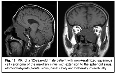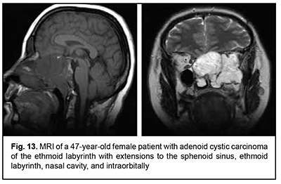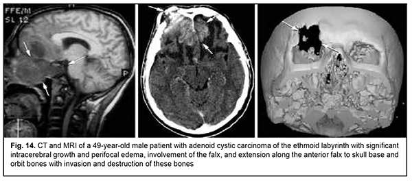 Keratinized squamous cell carcinoma and non-keratinized squamous cell carcinoma are similar in their course and grow locally. Their intracranial growth is mild (Figs 11, 12). Adenoid cystic carcinoma is a highly differentiated cancer that commonly grows locally at the site of origin. The tumors grow expansively (Fig. 13), and may extend intracranially and intracerebrally. Adenocarcinomas are malignant tumors of the lacrimal and salivary glands and paranasal sinuses characterized by early intracerebral invasion with an aggressive course. Fig. 14 shows the adenocarcinoma of the ethmoid labyrinth with significant intracerebral growth and perifocal edema, involvement of the falx, and extension along the anterior falx to skull base and orbit bones with invasion and destruction of these bones.