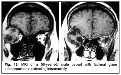 The most aggressive growth and course among epithelial lacrimal gland tumors is seen in adenocarcinomas (Fig. 15). Adenocarcinoma had the highest rate of mortality (67.7%) among PELGT with involvement of the cranial cavity and cerebrum, followed by adenoid cystic carcinoma (47.7%) and pleomorphic adenoma (37.5%). In addition, although pleomorphic adenoma of the lacrimal gland is a benign tumor, its rate of mortality was 9.1%. This could be explained by the fact that, like malignant tumors, these benign tumors tend to recur and transform to adenocarcinomas, adenoid cystic carcinomas and pleomorphic adenomas. The recurrence rate for malignant PELGT was 47.5%, and for benign PELGT, 23.5%. It is noteworthy that we have observed recurrences of pleomorphic adenoma even after 20 years after primary tumor excision.
