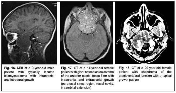Leiomyosarcoma of the lateral scull base is a tumor with an invasive/ expansive growth pattern, intradural and intracerebral extension, and fusion with surrounding tissues (Fig. 16). Osteoblastoclastoma is a primary bone tumor that may run a benign or malignant course and is characterized by a recurrent growth pattern. Large osteoblastoclastomas frequently bleed and display significant intracranial and extradural extension (Fig. 17). Chordomas develop from remnants of the notochord and can arise at any level of the cranioaxial axis, most commonly, the sphenoidal or sacral level. They have an aggressive and invasive growth pattern with a high risk of recurrence and exhibit early epidural extension. As time goes on, a chordoma (especially, a recurrent chordoma) acquires signs of invasive growth and becomes characterized by intradural and subdural extension. Skull base chordomas are tumors extending centrally, as opposed to skull base chordosarcomas that extend in a lateral direction. Chondroma is a benign tumor that originates from the cartilaginous tissue, shows slow epidural growth and may undergo malignant transformation to chondrosarcoma. In addition, chondroma is characterized by recurrent growth pattern and, with recurrence or after undergoing transformation to chondrosarcoma, it displays invasive growth into the dura mater. The typical location of chondroma is at the craniovertebral junction (Fig. 18). Similar to chondroma, chondrosarcoma runs a course with an expansive growth pattern that is accompanied by bony destruction of the central skull base (sphenoidal sinus, sella turcica, clivus of the occipital bone, and posterior ethmoid labyrinth). However, as opposed to chondroma, chondrosarcoma grows invasively, most commonly extends into the epidural space and frequently recurs, exhibiting intradural or extradural extension. In addition, chondrosarcomas, especially large tumors, frequently fuse with the dura mater (Fig. 19).