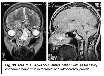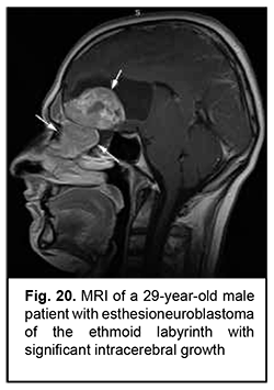 Esthesioneuroblastoma is a tumor that originates from the olfactory epithelium in the superior nasal meatus and grows invasively (Fig. 20). It is located close to the lamina cribrosa, which causes its further intracranial and intracerebral extension. Patients with esthesioneuroblastoma tend to have better survival rates than those with malignant epithelial ASBOT due to radical surgery and effective combination therapy of cancer.