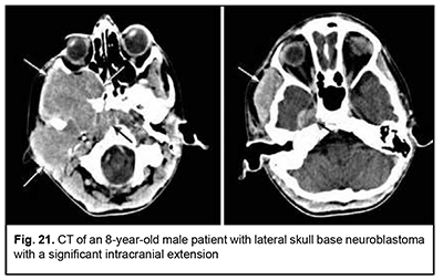 Neuroblastoma originates from neural crest cells of the the sympathetic nervous system, has an aggressive course and invasive growth pattern, and can grow to giant sizes (Fig. 21). Discussion ASBOT arise from the head-and-neck tissues, particularly, (1) bone and cartilage tissues; (2) orbit tissue; (3) facial and hairy scalp skin; (4) remnants of the notochord; (5) nasal cavity mucosa and paranasal sinus mucosa; (6) lining and glandular epithelium; (7) dura mater; and (8) vessels, nerves and sympathetic ganglia [13]. Most ASBOT are the tumors originating in the nasal cavity and paranasal sinuses and extending to and growing into the skull base, and extending intracranially. Nasal cavity and paranasal sinus tumors are commonly malignant [11, 14]. With regard to the origin and extension of benign ASBOT, it has been reported that craniofacial osteomas are tumors with intracranial growth and multidirectional extensions affecting anterior skull base bones [14], whereas meningiomas had primary intra- and extracranial growth at the sites of ethmoid labyrinth, medial middle cranial fossa and medial posterior cranial fossa [14-18], which is in agreement with our findings. Our findings with regard to malignant ASBOT are close to those of others who have reported that adenocarcinomas, unspecified cancers and adenoid cystic carcinomas are malignant tumors characterized by early intracerebral and intracranial invasion with an aggressive course. In addition, these cancers are characterized by continuous invasive growth with extension into the orbit where the tumor grows into the periorbit and orbital fat. These tumors have an unfavourable prognosis for survival [5, 11, 19-24]. The current study demonstrated that an intracranial extension with destruction of the roof and external wall of the orbit is also seen in PELGT that originate in the orbit and exhibit aggressive and recurrent growth [6, 7-10, 12, 25]. The course of cancers of other origins (neuroblastoma, leiomyosarcoma, osteoblastoclastoma, chondrosarcoma) is not less malignant than that of the above cancers. They have an aggressive course and invasive growth pattern, and can grow to giant sizes and extend intradurally and intracerebrally, showing fusion with surrounding tissues [26-31]. According to our findings and those of others, such benign tumors of cartilage origin as chordoma and chondroma grow slowly, show slow and expansive growth, and extend centrally. However, chondroma may undergo malignant transformation to chondrosarcoma and have a recurrent course [11, 19, 29-31]. The expansive growth of these tumors is accompanied by bony destruction with intradural or subdural extensions [28, 31, 32]. Patients with esthesioneuroblastoma tend to have better survival rates than those with other malignant ASBOT if early treated with radical surgery and effective combination therapy [12, 18, 33-36]. Therefore, large and even giant size is a common feature of ASBOT; this is true also for primary tumors diagnosed for the first time. On the basis of the analysis of patient complaints and clinical aspects and comparison of this data with imaging data, we found that ASBOT have a long asymptomatic stage. In addition, we broadly categorized patient complaints into cerebral, rhynologic, neuro-ophthalmologic and otologic, and found that these complaints were almost as common in patients with benign as with malignant ASBOT. The nature of complaints depended on tumor extension to relevant cerebral and skull base structures. We also determined frequencies of injury to various compartments of the intra- and extra-cranial surfaces of the skull base for benign and malignant processes. Compared with malignant ASBOT, benign ASBOT were found to be more commonly located in the lateral skull base (with a rate as high as 40.6%). Malignant ASBOT were more commonly seen within the floor of the anterior cranial fossa (77.2%). There are certain grades of intracranial growth for malignant ASBOT and intracranial extension for benign ASBOT, these grades depending mostly on histobiological characteristics and disease duration. Adenocarcinoma originating in the lacrimal gland is the most aggressive form of epithelial cancer of the orbit with a rate of mortality of 67.7%. While growing, it causes destruction of the roof and external wall of the orbit with extension into the temporal fossa and cranial cavity and involvement of the cerebrum.