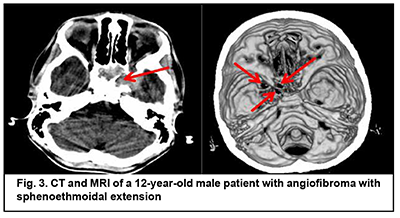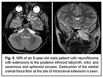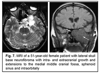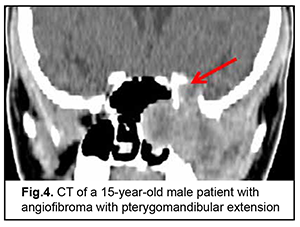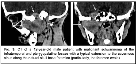 Cerebral and focal neurologic complaints were the most common type. In addition, these complaints were almost as common in patients with benign ASBOT (39.8%) and in those with malignant ASBOT (40.9%) (р > 0.05). Headache, dizziness, fatigue, general weakness, and somnolence were classified as cerebral complaints. Focal neurologic symptoms included facial numbness (impaired CN 5 function) in 15 patients, facial asymmetry (CN 7 dysfunction) in 5 patients, impaired swallowing and phonation (caudal nerve dysfunction) in 3 patients. The severity of cerebral and focal neurologic symptoms depends on the degree of intracranial extension of the lesion and potential cerebral edema. Of note that intracranial hypertension was observed only in patients with significant cerebral edema. Difficulties with nasal breathing, purulent nasal discharge, and epistaxis (due to tumor obstruction of the natural foramina between sinuses and consequently impaired natural ventilation of the nasal cavity and paranasal sinuses) were classified as rhynologic complaints. There was no significant difference in the frequency of these complaints between patients with benign ASBOT (28.7%) and those with malignant ASBOT (27.1%) (р > 0.05). A progradient course of rhynologic symptoms was a feature of our patients with ASBOT. Rhynologic complaints did not improve, but increased in severity with time. It should be noted that, in the current study, epistaxis was occasional and mostly in patients with nasopharyngeal angiofibroma. Reduced visual acuity, diplopia, oculomotor abnormalities, ophthalmoplegia, exophthalmos, tearing, eyelid swelling and chemosis and ocular pain were classified as neuroophthalmologic complaints. Neuroophthalmologic complaints and the third most common type of complaints, and were caused by extension of the craniofacial lesion into the orbit. In addition, these complaints were almost as common in patients with benign ASBOT (21.3%) and in those with malignant ASBOT (25.9%) (р > 0.05). Otologic complaints were the least common in our patients with ASBOT. They included hearing loss, noise, and stuffy ear, and were caused by eustachian tube obstruction and expansive tumor growth or tumor-associated inflammation. Another cause was expansion of the tumor to middle and inner ear structures with their subsequent destruction and hearing loss. Otologic complaints were common in patients with benign ASBOT (10.2%) than in those with malignant ASBOT (6.1%), but the difference was not significant (р > 0.05). It should be noted that the frequency of rhynologic complaints caused by rapid expansion of the tumor in the nasal cavity or orbit and periorbital growth was almost the same as the frequency of rhynologic complaints due to these causes. Patients with benign ASBOT had practically the same complaints as patients with malignant ASBOT, and the severity of these complaints mostly depended on lesion extension and tumor growth duration. Most patients with benign and malignant PELGT had complaints associated with nasal displacement of the globe by the newly formed tissue at the superior and outer surface of the upper eyelid (the lacrimal gland area) and limited upward and outward movement of the globe (53.8% and 58.2% of cases, respectively). In addition, in most patients with benign and malignant PELGT, the tumor mass was dense (92.2% and 96% of cases, respectively), the tumor surface smooth (72.6% and 66.1% of cases, respectively), the tumor mass immobile with respect to the bony orbital walls (66.6% and 83.0% of cases, respectively). The following clinical signs were found significant for differentiating a malignant from a benign PELGT: ptosis (Δ%=15.8, р=0.04), conjunctival hyperemia (Δ%=21.6, р=0.01), diffuse pattern of tumor growth (Δ%=21.5, р=0.05), impossibility of globe reposition (Δ%=22.3, р=0.03), and pain in palpation of the tumor (Δ%=9.4, р=0.04). Benign ASBOT Jjuvenile nasopharyngeal angiofibroma grows slowly, but tends to recur and/or grow into the structures adjacent to the epipharynx and nasal cavity, which may seriously complicate tumor excision. There was CT and MRI evidence that the tumor exhibited sphenoethmoidal and pterygomandibular patterns of growth (Figs 3, 4). An angiofibroma grows in an asymptomatic way extradurally through expanded natural foramina of the middle skull base, particularly, foramen ovale, foramen rotundum and fissura orbitalis superior. The tumor also exhibits extension into the cavernous sinus due to destruction of the lateral walls and floor of the sphhenoidal sinus. Initially, the tumor affects the pterygopalatine and infratemporal fossae, and, subsequently, expands to the cavernous sinus through the natural foramina of the middle skull base, particularly, foramen ovale, that becomes significantly expanded, foramen rotundum and fissura orbitalis superior. In addition, the tumor displaces the cavernous sinus, but becomes located extradurally, beyond the sinus. This is accompanied by symptoms of oculomotor nerve damage, reduced visual acuity due to destruction of the wall of the optic nerve canal and orbital cone, optic nerve compression and tumor mass filling the orbit, which was observed in this case. Patients with angiofibroma usually do not notice such symptoms as moderate headache and stuffy nose. Nasal bloody discharge and oculomotor abnormalities prompted suspicion for a nasal cavity tumor. This required additional examination (particularly, MRI of the brain) that led to finding the tumor.