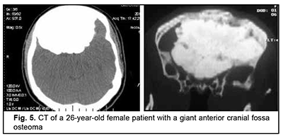 Osteoma originates from osteoblasts of the bony tissue and is categorized as osteoma compactum and osteoma spongiosum. It forms mostly on the external bone surface. When developing in the medullary cavity, it is known as enostosis. The course of the disease is commonly asymptomatic and the growth of osteoma may continue over years, leading to deformation of the facial skeleton and intracranial growth. It is not uncommon that the tumor is found accidentally in the course of examination for mild headache. Fig. 5 shows a giant anterior cranial fossa osteoma that had been growing for decades, with the patient being symptomless for a long time. The tumor extended intracranially, invaded the orbit and nasal cavity, and had a characteristic lumpy surface pattern due to a difference in growth rate between various surface sites. The only symptom noted in the months preceding the patient’s admission to hospital was her psychopathological behavior.