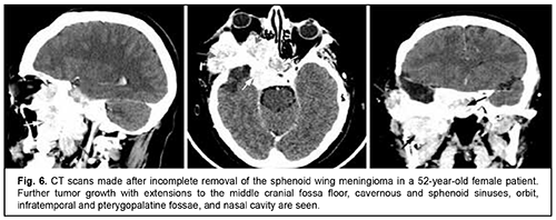 Craniofacial meningioma usually develops due to incompletely removed olfactory fossa meningioma, sphenoid wing meningioma or middle cranial fossa meningioma. A meningioma in any of the above locations, if incompletely removed (particularly, incompletely removed skull base infiltration) may become the origin of the subsequent growth on the inner and outer skull surfaces. We noted intra- and extra-cranial growth of primary meningioma at the ethmoid labyrinth, medial middle cranial fossa and medial posterior cranial fossa. Fig. 6 exemplifies the further spread of the sphenoid wing meningioma to the middle cranial fossa floor, cavernous and sphenoid sinuses, orbit, infratemporal and pterygopalatine fossae, and nasal cavity after incomplete tumor removal. It is noteworthy that, within the field of ophthalmic oncology, sphenoid wing meningiomas constitute a major portion of the large tumors of the anterior skull base and orbit. The tumor extends intracranially and extracranially from the pterygopalatine fossa, leading to destruction of the floor of the medial middle cranial fossa and the involvement of the cavernous sinus (Figs. 7, 8).