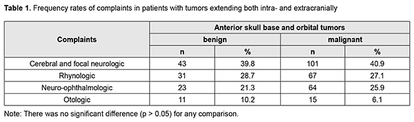 Benign ASBOT developed somewhat more frequently in the lateral skull base (the middle cranial fossa floor, infratemporal and pterygopalatine fossae) than in the middle skull base (the anterior cranial fossa floor, ethmoid labyrinth, orbit, and sphenoidal sinus), and this difference was mainly due to skull base angiofibroma (Fig. 1). Therefore, the most common primary location of benign ASBOT was extracranial (51% of patients), followed by skull base bone and cartilage (27%) and intracranial (22%). As opposed to benign ASBOT, most malignant ASBOT (60%) developed in the middle skull base (the anterior cranial fossa floor, ethmoid labyrinth, orbit, and sphenoidal sinus) (Fig. 2). The primary location of malignant ASBOT was more commonly extracranial (ethmoid labyrinth; sphenoidal, maxillary and frontal sinuses; nasal cavity, orbit; infratemporal and pterygopalatine fossae, external ear and parotic area; 81% of patients) than skull base bone and cartilage (19%). The intracranial site included the middle cranial fossa floor, anterior cranial fossa floor, and basilar clivus. We found that the process of ASBOT spread may be divided into phases. The phase of bony destruction of the medial orbit wall was followed by that of the anterior cranial fossa as the tissue mass filled the nasal cavity and paranasal sinuses. The bone destruction phase was followed by the epidural expansion of the tumor which was in some cases followed by tumor adhesion to or growth into the dura mater. Tumors of the anterior skull base and orbit are commonly large by the time they are diagnosed due to a prolonged asymptomatic course. The complaints of patients with ASBOT were placed into four broad categories (Table 1).
