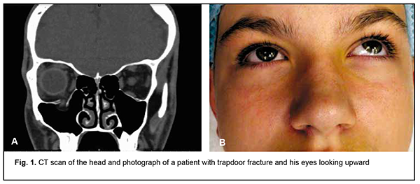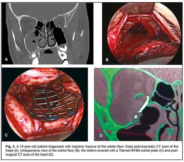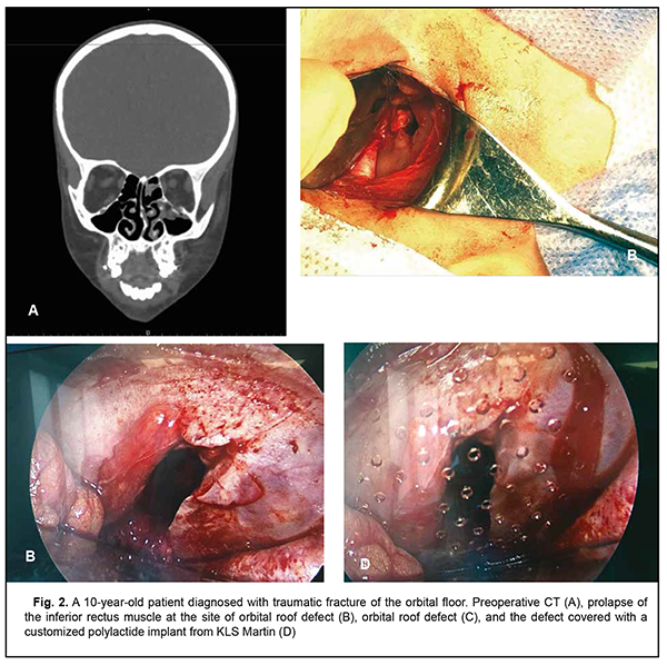Introduction Improving management of patients with orbital wall fractures is essential for maxillofacial surgery practice and of high medical and social importance. This type of trauma is relatively common and accounts for 2% to 10% of all facial bone fractures [1, 2]. Algorithms for treating adults with orbital wall fractures have been described in detail in the literature. In addition, these algorithms continue to improve through implementation of novel diagnostic and treatment methods, particularly, trauma analysis systems and applications of patient-specific implants [1-3]. There are, however, differences in clinical and CT findings between pediatric and adult patients with traumatic orbital injuries [1,4-6]. Although these injuries are less common in children than in adults, their possible complications make them medically and socially important [1,4-6]. Best management strategy in children with orbital trauma remains controversial, particularly with regard to selecting treatment tactics, optimal time point and the method to be employed (customary ) for surgical treatment [1,6]. This is due to the structure and development of the pediatric viscerocranium as well as lack of consensus on the effect of treatment measures on midface development [1,4-7]. Adequate verbal contact between the doctor and the pediatric patient cannot be obtained, and psychoemotaional status of pediatric patients is age-specific; this contributes to difficulties in the diagnosis and treatment of pediatric orbital trauma. Objective factors also contribute to difficulties in the diagnosis, when increasing symptoms of traumatic brain injury and concomitant facial bone fractures mask the presence of functional abnormalities and anatomical changes resulting from orbital trauma [4-6, 8-10]. Orbital roof fractures tend to occur in children younger than 8 years, whereas orbital floor fractures, in older children, which is caused by stage of craniofacial skeletal development and tooth eruption in children [4-6, 11]. In addition, resilient bone tissue is characteristic for pediatric viscerocranium. It is this that causes orbital-floor blowout fractures of the trapdoor variety, first described by Soll and Poley [5, 8]. In this type of fracture, local damage to the orbital wall results from abrupt dislocation of the eye globe after the eye sustained a blow. A bone fragment from the thinnest site of the orbital floor gets displaced to the maxillary sinus. The resulting defect gets displaced and retraction of the inferior rectus takes place. However, the bone fragment restores its initial position due to above mentioned tissue elasticity, leading to entrapment of soft tissue structures between bone fragments (Fig. 1).
