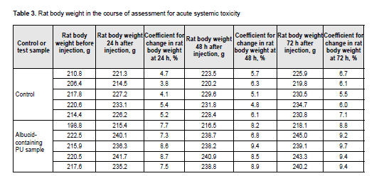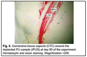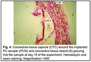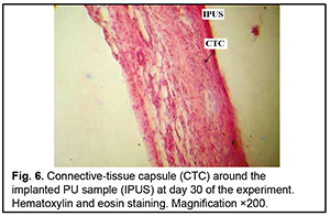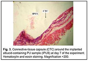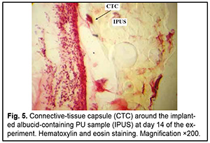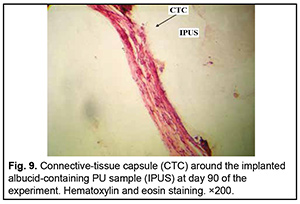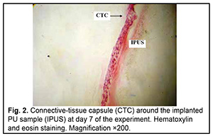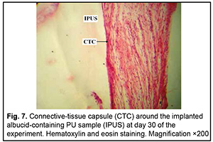 http://doi.org/10.31288/oftalmolzh202063037 Received: 23 April 2020; Published on-line: 21 December 2020 Response of soft tissues and abdominal organs of rabbits and rats to implanting albucid-containing cross-linked polyurethane composite N. A. Galatenko1, R. A. Rozhnova1, D. V. Kuliesh1, T. V. Visloguzova1, A. P. Maletskyy2, N. M. Bigun3 1 Institute for Chemistry of High-Molecular Compounds, Academy of Science of Ukraine; Kyiv (Ukraine) 2 The Filatov Institute of Eye Diseases and Tissue Therapy of the NAMS of Ukraine; Odesa (Ukraine) 3 Lviv Regional Clinical Hospital; Lviv (Ukraine) E-mail: maletskiy@filatov.com.ua TO CITE THIS ARTICLE: Galatenko NA, Rozhnova RA, Kuliesh DV, Visloguzova TV, Maletskyy AP, Bigun NM. Response of soft tissues and abdominal organs of rabbits and rats to implanting albucid-containing cross-linked polyurethane composite. J.ophthalmol.(Ukraine).2020;6:30-7. http://doi.org/10.31288/oftalmolzh202063037 Background: Craniofacial injuries represent 29% of all trauma cases, and patients need to have their affected orbit, orbital adnexa, and periorbital area surgically reconstructed or restored. However, the outcomes of these procedures depend also on the quality of implant materials. Previously, we have developed a polymer material made of cross-linked polyurethane (PU) and containing a biologically active substance, albucid; it seems to be a promising implant material. Purpose: To investigate experimentally the response of soft tissues and abdominal organs of animals (rabbits and rats) to implanting the albucid-containing cross-linked PU composite. Material and Methods: Assessment of soft tissue response to implantation of the synthetic polymer material. The skin response to implanting the albucid-containing cross-linked PU composite was assessed through the intracutaneous injection of the extract of the test material in rabbits. The soft tissue response was assessed through subcutaneous implantation of cross-linked PU composites in Wistar rats. The response of abdominal organs to implanting the cross-linked PU composite was assessed through the intraperitoneal injection (20 ml per kg body weight) of the extract of the test material in Wistar rats. Conclusion: The intracutaneous injection of the extract of the test material caused neither erythema nor edema in rabbits, and the test sample of the albucid-containing cross-linked PU composite was considered non-irritating, since a difference between the average scores for the test extract and control extract (i.e., a value of the primary irritation index) was of 0 to 0.4 points. Over the period of observation of potential acute systemic toxicity, no animal injected with the extract of the test material (the albucid-containing cross-linked PU composite) displayed higher biologic response than animals injected with the control extract, and the test sample of the albucid-containing cross-linked PU composite conformed to the requirements of tests for systemic toxicity. This study demonstrated a natural process for a foreign body residing in the body (gradual foreign body separation from the surrounding tissues due to formation of a connective tissue capsule) after implantation of the samples of cross-linked PU composites in animal bodies. The cellular responses were (1) typical for a living body response to the presence of a foreign body at the site of implant placement and (2) characteristic for aseptic inflammation. The test samples produced moderate irritation when placed into the animal’s body. Ключові слова: сітчастий поліуретан, альбуцид, імплантація, реконструктивні операції на органі зору, гостра системна токсичність, локальні ефекти