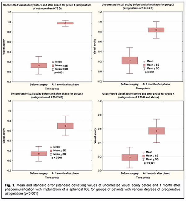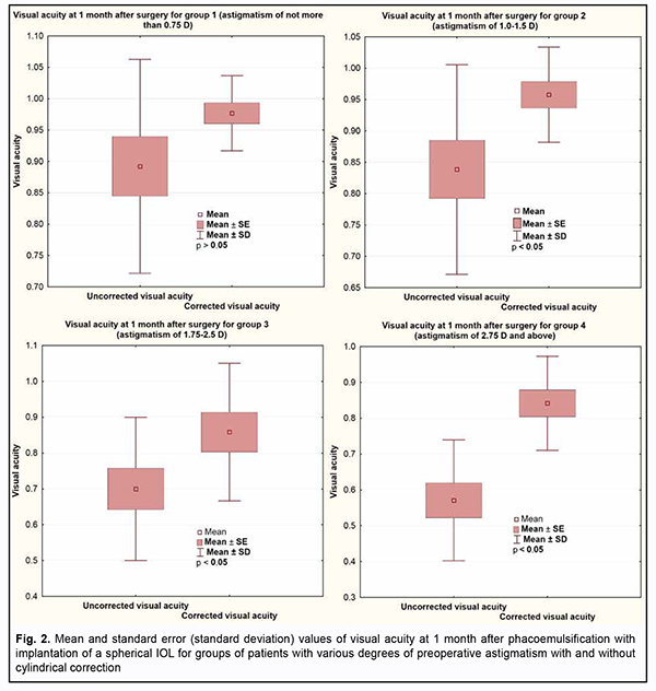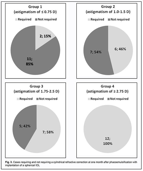 Introduction Cataract phacoemulsification has become the gold standard and the most common type of cataract surgery which produces rather fast, well-predictable and accurate refractive outcomes [1]. A cataract surgeon should aim to achieve a less than or equal to 0.5D difference between target and actual refraction after phacoemulsification and intraocular lens implantation [2], taking into account the spherical component and astigmatism. Studies have demonstrated that inadequate vision in the presence of astigmatism can result in reduced quality of life and an increased incidence of trauma. In addition, even mild astigmatism is accompanied by a decrease both in visual acuity and capacity to perform daily tasks requiring discrimination (e.g., driving a car). Astigmatism axis orientation beyond the horizontal meridian substantially impedes reading rate [3-5]. Patients with a high degree of astigmatism who had cataract surgery with spherical intraocular lens (IOL) placement are often dissatisfied with treatment outcomes because their uncorrected distance visual acuity remains rather poor due to astigmatism [6, 7]. Approximately 30 percent of the world’s population has astigmatism of at least 0.75D which results in decreased visual acuity after surgery [8]. Therefore, particular emphasis is being put to preoperative corneal astigmatism, and a variety of approaches (such as selecting tunnel incision location and width; use of corneal or limbal relaxing incisions; use of the opposite tunnel incision; and toric IOLs) have been proposed for its correction [6]. Surgically induced astigmatism is being discussed in the literature, may be severe and depends not only on incision size, but also on major anatomic and functional characteristics of the eye, including preoperative corneal astigmatism, anteroposterior length of the eye, and corneal rigidity and thickness [9, 10, 11, 12]. Although to date ophthalmic surgeons prefer implanting toric IOLs and there have been attempts at improving the design both of these IOLs themselves and their haptics, the problem of their postoperative rotation has not been solved completely [13]. Postoperative rotation of a toric IOL is accompanied by a significant decrease in visual acuity and deterioration of quality of vision, which significantly restricts their wide application in the clinical practice. It is still being discussed whether it is reasonable to implant spherical IOLs in eyes with corneal astigmatism, but the impact of preoperative parameters (such as degree and axis of preoperative astigmatism) on refractive outcome, quality of vision and requirement for additional correction after surgery is yet to be established. The purpose of the study was to assess the effect of corneal astigmatism on refractive outcomes of phacoemulsification with implantation of a spheric IOL. Material and Methods This paper presents the results of a retrospective study at the VISUS clinic, the clinical setting of the Department of Ophthalmology at the Zaporizhzhia State Medical University. We retrospectively analyzed the outpatient medical records of 39 patients (50 eyes) who received phacoemulsification with a spherical IOL and had corneal astigmatism of 0.5-3.75D (as assessed by keratometry). Patient age varied from 30 to 83 years (mean age, 62 ± 1.89 years). The numbers of male and female patients were approximately equal (24 (48%) and 26 (52%)). Each study eye received a spherical IOL which was usually selected by the patient. Of the 50 implanted IOLs, 38 were monofocal, 9, multifocal, and 3, trifocal. The surgical procedures were performed by three surgeons with an induced astigmatism of ≤ 0.25 D. A tunnel incision was made at 160°–180°. No complications were observed during or after surgery. Follow-up duration was 1 month. Eyes were divided into four groups based on the degree of corneal astigmatism: group 1, astigmatism of not more than ± 0.75 D (13 eyes, 26%), group 2, astigmatism of ±1.0 to ±1.5 D (13 eyes, 26%), group 3, astigmatism of ± 1.75 to ± 2.5D (12 eyes, 24%), and group 4, astigmatism of ± 2.75D and more (12 eyes, 24%). An eye examination included visual acuity assessment, automated refraction with auto-ref/keratometer (Unicos URK-700, Korea), biomicroscopy, direct ophthalmoscopy, tonometry, perimetry, ultrasound A-scanning (Pacscan Series 300А; Sonomed, USA), endothelial microscopy (SP-3000P, Topcon Corporation, Tokyo, Japan), and optical biometry and IOL calculation (IOL Master 700 - Carl Zeiss Meditec AG, Jena, Germany). Of the 50 eyes, 35 (70%) had immature cataract; 2 (4%), mild cataract; 8 (16%), mature cataract; 1 (2) overmature cataract, and 4 (8%) underwent refractive cataract surgery due to hyperopia and presbyopia. Statistical analyses were conducted using Statistica 13.0 (StatSoft, Tulsa, OK, USA) software (License No. JPZ8041382130ARCN10-J). The level of significance p < 0.05 was assumed. Data are presented as mean (M) and standard error of mean (m). Shapiro–Wilk W test was used to test normality. Student t test was used for paired series if the data fit for normal distribution. Non-parametric Mann-Whitney test was used if variables were not normally distributed. Results We aimed to assess the results of phacoemulsification with implantation of spherical IOLs in eyes with various degrees of preoperative astigmatism, and the first thing we were interested in was the impact of induced astigmatism on refractive outcome. Table 1 presents corneal astigmatism values for eyes with various degrees of presurgical astigmatism before and 1 month after surgery. There was no significant difference in change in corneal astigmatism values after phacoemulsification. The mean increase in astigmatism magnitude varied from ± 0.01 D to ± 0.13 D. The most substantial increase in astigmatism magnitude (with presurgical astigmatism of 1.75D-2.5D), by 6.5%, was observed for eyes from group 3, but the difference for this group and any other group was n