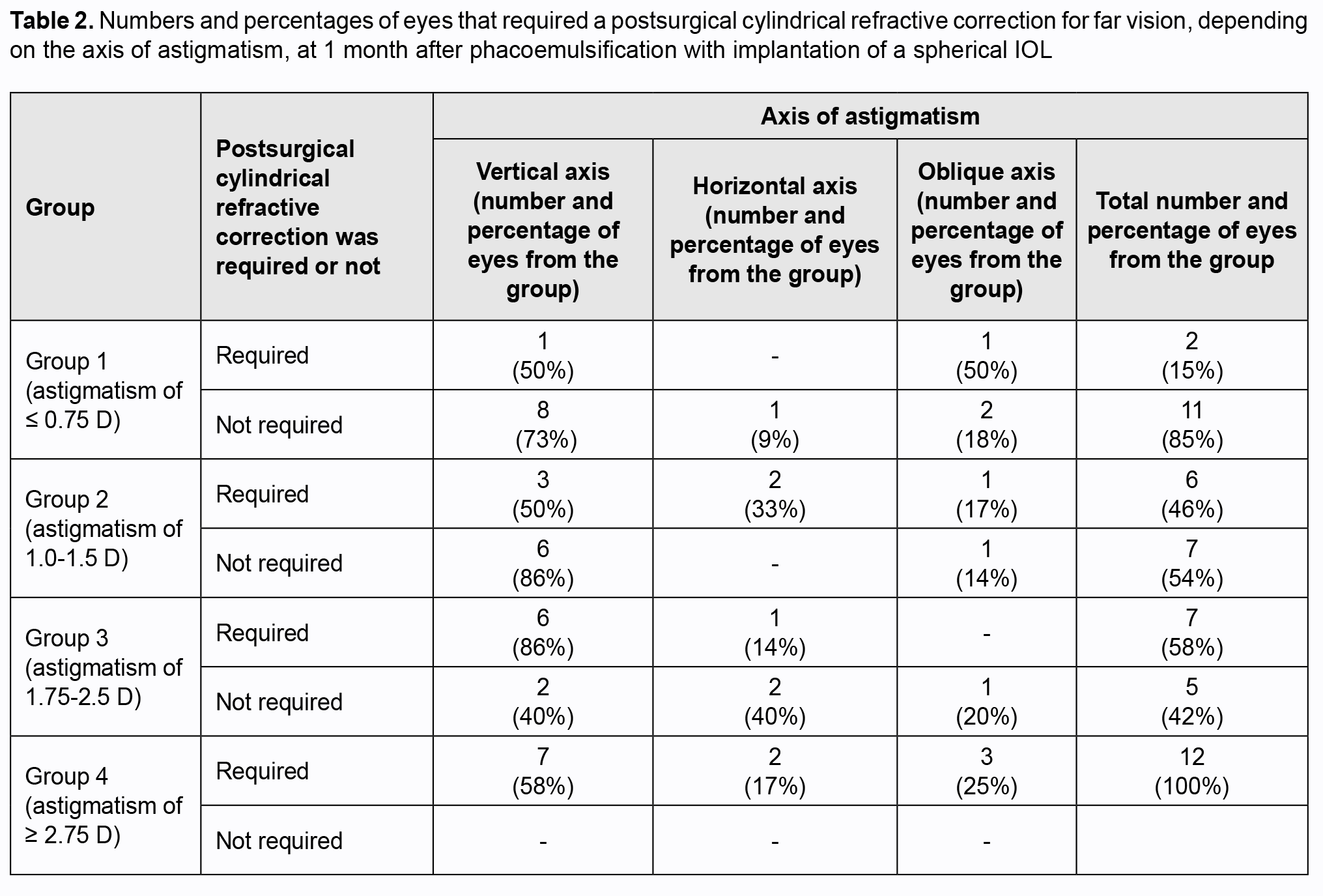 The axis of astigmatism was also important for subjective adaptation of the operated-on eye. Table 2 presents the numbers and percentages of eyes that required a postsurgical cylindrical correction, depending on the axis of astigmatism. It is worthy of note that, among patients from groups 1 to 3, those with a vertical (or close to vertical) axis of astigmatism felt themselves more comfortable and did not need postsurgical cylindrical correction. Thus, among the eyes from groups 1, 2 and 3 that did not need postsurgical cylindrical correction, 8 (73%), 6 (85%) and 2 (40%), respectively had a vertical axis of astigmatism.