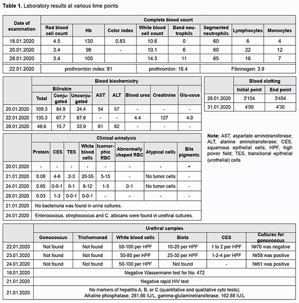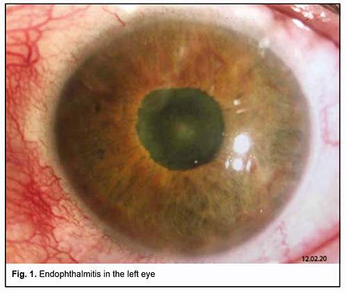 Gonorrhea, a human infectious disease that may be acute or chronic, is mostly sexually transmitted, causes inflammation commonly within urogenital mucous membranes, and is manifested by secretions. Galen, a Greek physician (AD 130-200), is credited with naming gonorrhea after gonos (semen) and rhoia (to flow), but the disease had been known much earlier. Neisser first observed the causative agent, gonococcus, in stained smears of vaginal, urethral and conjunctival exudates in 1879. N. gonorrhoeae belongs to the family Neisseriaceae (Bergey's 1997), and is a member of the genus Neisseria. There are an estimated 86.9 million gonorrhea infections occurring each year [1]. Gonococci can affect also mucous membranes of the rectus, eye and pharynx; they rarely cause generalized infection and marked intoxication [2, 3]. Extragenital N. gonorrhoeae infections can be divided into conjunctivitis, infections of the mouth and pharynx (stomatitis, gingivitis, pharyngitis and laryngitis), disseminated gonococcal infection (bacteriemia, conjunctivitis, iridocyclitis, dermatitis, myositis, meningitis, pleurisy, arthritis, synovitis, and osteomyelitis), and acute gonococcal perihepatitis [3]. Disseminated gonococcal infection (DGI) is very rare, affecting 0.1-0.3% of patients with gonorrhea, and can occur as a result of metastasis from the site of primary infection. DGI has been reported to have a female predominance, with a female to male ratio of 4:1, and is especially frequent in pregnancy. It is manifested clinically by fever, tenosynovitis (asymmetric, involving hands and feet), arthritis, hepatitis, mild myopericarditis, and rash, most commonly, on the distal extensor surfaces of the limbs [2, 4]. Disseminated gonococcal infection may be complicated by the development of gonococcal sepsis, which is sometimes accompanied by endo-, myo-, and pericarditis, meningitis, brain abscess, peritonitis, osteomyelitis, synovitis, with lesions of the liver and kidneys, and these disorders have no pathognomonic symptoms. Most commonly, general condition is moderately severe, with intermittent fever (38-40.5°С), chill, joint pain, and skin lesions. A diagnosis of DGI is confirmed by blood cultures [2]. The course of gonococcal sepsis is variable, like for all types of septicemia [5]. There is no difference in clinical picture or disease course between gonococcal septicopyemia and any other pyaemia, but the former is less resistant to antibiotics, and advances in antibiotics have improved treatment outcomes of gonococcal septicopyemia. Bacterial endocarditis secondary to infection caused by N. gonorrhoeae was the leading cause of infectious endocarditis prior to the antibiotic era, accounting for up to 26% of all cases. During the period after the introduction of penicillin in 1942 and until 1979, there were only 11 culture-proven cases of gonococcal endocarditis in the English literature. A more common type of gonopyemia is a mild form with intermittent fever (38-39 °С), chill, arthralgia or arthritis and typical skin rash. This form of septicemia has been called “benign gonococcemia” or “gonococcal dermatitis syndrome”. However, whether even the mildest form of septicemia is really benign is a question. It has been noted that all types of gonococcal sepsis can be commonly well treated by antibiotics, if appropriate therapy is initiated before irreversible changes develop in the organs. Therefore, the clinical continuum of gonococcal lesions ranges from as mild as asymptomatic infection of mucous membranes to as severe as purulent meningitis and gonococcal sepsis. To the best of our knowledge, in recent years, there have been no reports of fatal cases of gonococcal sepsis. In addition, cases of gonococcal septicemia with the development of suppurative and metastatic foci of infection, endocarditis and meningitis have been rarely reported, and cases of gonococcal septicemia associated with Fitz-Hugh-Curtis syndrome have been extremely rarely reported [6]. ICD-10 A54.8 code (“Other gonococcal infections”) includes gonococcal: brain abscess, endocarditis, meningitis, myocarditis, pericarditis, pneumonia, sepsis and skin lesions; these infections should be also taken into account. Moreover, ICD-10 A54.3 code (“Gonococcal infection of eye”) includes gonococcal: conjunctivitis, iridocyclitis and ophthalmia neonatorum due to gonococcus. Gonococcal ocular lesions develop most commonly due to poor hygiene habits, when the infection is transmitted by eye-hand contact [2]; in addition, they may develop when the infection is transported to the eye as a result of hematogenous or lymphogenous spread. The pathogen may affect the neonatal eye either as a result of transplacental passage of the pathogen to the fetus or during passage of the fetus through the birth canal. The incubation period of gonococcal infection generally ranges from 3 to 19 days [7]. On examination, there are marked lid edema, photophobia and copious purulent discharge in the eye corners. The conjunctiva is markedly hyperemic, and mild conjunctival hemorrhage is observed. Gonococcal conjunctivitis may have an asymptomatic course as well. In more severe disease, the cornea is involved, and isolated perforated corneal ulcers develop. Progression of this process may result in ulcerous destruction of the cornea and panophthalmitis, leading to blindness. The purpose of this work is to present a rare case of endophthalmitis secondary to gonococcal sepsis, and to highlight its clinical features. A male patient born in 1975 was under supervision at the Department of Ocular Trauma of the Filatov institute. On January 18, 2020, he was taken by the emergency team to the Department of Urology of the city hospital, where he was diagnosed with acute suppurative gonococcal prostatitis (and retention of urine, severe sepsis with liver abscess, suppurative blepharitis of the left eye, and suppurative tonsillitis) and stayed until February 4, 2020. On admis