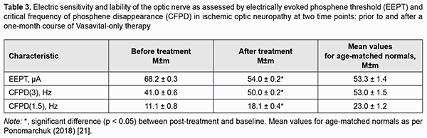 http://doi.org/10.31288/oftalmolzh202113845 Received: 02 November 2020; Published on-line: 12 February 2021 Clinical experience of the use of Vasavital® in dry age-related macular degeneration and ischemic optic neuropathy V. S. Ponomarchuk, N. I. Khramenko, N. V. Konovalova The Filatov Institute of Eye Diseases and Tissue Therapy of the NAMS of Ukraine; Odesa (Ukraine) E-mail: kolomiets.wa@gmail.com TO CITE THIS ARTICLE: Ponomarchuk VS, Konovalova NV, Khramenko NI. Clinical experience of the use of Vasavital® in dry age-related macular degeneration and ischemic optic neuropathy. J.ophthalmol.(Ukraine).2021;1:38-45. http://doi.org/10.31288/oftalmolzh202113845 Background: The chronic ischemic process caused by impaired hemodynamics in the eye and brain is a component of the pathogenesis of ischemic optic neuropathy and age-related macular degeneration, and requires prompt and adequate treatment. Purpose: To examine the effect of a one-month course of Vasavital on the function of the visual system and regional hemodynamics in patients with dry age-related macular degeneration and those with ischemic optic neuropathy. Material and Methods: Thirty-two patients with dry age-related macular degeneration (AMD) (mean age, 66 ± 1.5 years) and 22 patients with chronic ischemic optic neuropathy (mean age, 57.0 ± 1.4 years) underwent examination and treatment at the Department of Uveitis and Laboratory for Functional Examination of the Visual System of the Filatov institute. They received a one-month course of Vasavital-only therapy at a dose of one capsule twice a day as an outpatient treatment. Patients reported their complaints and underwent routine eye examination, studies of regional hemodynamics in the eye and brain (by ophthalmic rheography and rheoencephalography with Reocom, the computerized rheography apparatus), and electrophysiological studies of electrically evoked phosphene threshold (EEPT) and critical frequency of phosphene disappearance (CFPD) at two time points: prior to and after a one-month course of Vasavital-only therapy. Results: A one-month course of Vasavital-only therapy resulted in 24% and 9.6%-25% increases in ocular pulse blood filling in patients with chronic ischemic optic neuropathy and patients with age-related macular degeneration with various baseline levels of visual acuity, respectively. In addition, vascular tone in large-and small-caliber ocular vessels decreased significantly, by 12-17%, in patients with chronic ischemic optic neuropathy, and by 10-20%, in patients with age-related macular degeneration, and vascular tone in large-caliber brain vessels (in the vertebral-basilar system) decreased by 21.6% in patients with ischemic optic neuropathy. A course of Vasavital-only therapy resulted in improved optic nerve function in patients with ischemic optic neuropathy, with a 20.5% improvement in electrically evoked phosphene threshold (EEPT), and 22-63% improvement in critical frequency of phosphene disappearance (CFPD); this indicated an improved function of the peripheral as well as central retina. Keywords: Vasavital, dry age-related macular degeneration, ischemic optic neuropathy