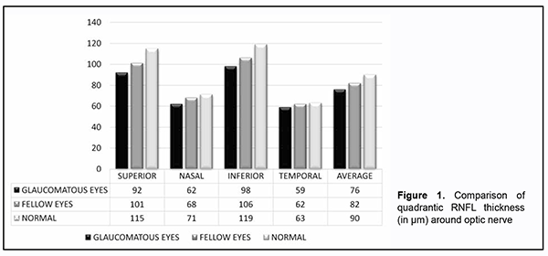 Introduction. Glaucoma is characterised by loss of ganglion cells and their axons, the Retinal Nerve Fiber Layer (RNFL). The loss of retinal ganglion cells in glaucoma is irreversible, therefore early detection is critical to prevent progression of the disease (by 1-4 yrs). Studies have shown that RNFL defects occur prior to visual field loss [1, 2] and also prior to Optic Nerve Head (ONH) changes [3, 4]. Also, it was found that RNFL evaluation is more sensitive for predicting future visual field loss compared to ONH evaluation and that the RNFL is a better predictor of damage than cup-disc ratio (CDR) [5, 6]. For visual field defects to be evident on white on white perimetry, it requires at least 30-40% of neuronal cell loss to occur Therefore, RNFL assessment has emerged as an important parameter for pre-perimetric diagnosis of glaucoma and this is done quite accurately by OCT machines by which it is possible to detect the loss of retinal nerve fiber layer Even though glaucoma is a bilateral disease, the structural and functional damage is asymmetric between the two eyes. Approximately 7-25% of glaucoma patients with unilateral visual field loss at baseline will later experience visual field damage in the fellow eyes and thus a more sensitive RNFL analysis by OCT could be an early indicator for impending damage caused by POAG [7]. Materials and methods This is a hospital based cross sectional study carried out at a tertiary care center of north India for the purpose of which 146 individuals including 73 healthy volunteers without POAG and 73 patients of POAG were recruited after patient’s consent and institutional ethical clearance adhering to the tenets of Declaration of Helsinki. All participants underwent detailed ophthalmological examination. Uncorrected and best corrected visual acuity assessment by Snellen’s chart, slit lamp examination, gonioscopy, tonometry by applanation tonometer, fundus examination by direct and indirect ophthalmoscope and by + 90-D lens, standard automated perimetry by Humphrey perimeter, and retinal nerve fiber layer analysis by optical coherence tomography by carl Zeiss OCT machine were performed. All patients below 40 years of age, having more than 4D of refractive error, any corneal or lens opacity, any other intraocular disease, any recent intraocular surgery or history of ocular trauma, having primary angle closure or secondary glaucoma, diabetes or any other neurological disorder affecting optic disc, RNFL thickness or visual fields were excluded from the study. Inclusion criteria for normal subjects was age > 40 years, best corrected visual acuity (BCVA) of 6/60 or better; less than 4D of refractive error, intraocular pressure (IOP) less than or equal to 21 mm Hg with no history of elevation of IOP in the past. Appearance of normal (healthy) optic disc, by direct and indirect ophthalmoscopy and standard automated perimetry (SAP) results within normal limits. Inclusion criteria for glaucoma group was patients with age > 40 years, IOP > 21 mm hg on three or more testing taken at different times of the day; vertical asymmetry of CDR > 0.2 between the two eyes or high CDR > 0.6 and visual field changes specific to POAG. Patients satisfying all the inclusion criteria for glaucoma group were included in the study. All participants underwent visual field testing using Humphrey Field Analyzer with either 24-2 full threshold or SITA- standard. Standard protocol of static white on white stimuli commonly known as SAP (30-2) was used to study the fields. Eyes with unreliable visual fields (false negatives >30%, false positive >30%, and fixation loses >15%) were excluded from the study. RNFL thickness measurement was done using cirrus SD-OCT (software version 4.0). Patients were dilated using 1% tropicamide before images were recorded and fast RNFL scans were performed. This protocol provides better reproducibility than a single scan. It consists of three circular scan each 3.46 mm in diameter, centred on the optic disc. Various machine generated parameters were used for evaluation of RNFL thickness including the average RNFL thickness, RNFL thickness in each quadrant- superior (46◦ to 135◦), inferior (226◦ to 315◦), nasal (136◦ to 225◦) and temporal (316◦ to 45◦) and RNFL thickness in 12 -50 degree clock hours sectors (12’o clock is superior position and 9’o clock is in the temporal position). The mean age ± standard deviation (SD) was 61 ±10.4 (range 50 to 62) with no significant difference of age and sex among the groups. There were 39.04% (57/146) males and 60.96% (89/146) females in the total study group. The range of mean deviation (MD) of glaucomatous patients on automated perimetry was -8.86 to +1.01 with mean ± standard deviation of -2.06 ± 6.80 (range= +1.01 to -8.86). The average best corrected visual acuity of the normal eyes was 6/18 and that for the glaucoma eyes was 6/24 and 6/18 for the fellow eyes The data was then collected, compiled and statistical analysis was done using SPSS (Statistical Package for Social Sciences) Version 21.0 statistical Analysis software. Quantitative data were summarized in mean ± Standard Deviation whereas Qualitative data were summarized in proportion percentages. The prevalence was shown in percentages with 95%confidance intervals. Groups were compared for quadrants and sector RNFL thickness by one-way analysis of variance (ANOVA). P value of less than 0.05 (p<0.05) was considered statistically significant. Results 146 eyes of 73 POAG patients (73 glaucomatous eyes and 73 fellow eyes of same patients) and 73 eyes of age matched normal individuals not having POAG were examined. On examining the RNFL thickness around optic nerve in glaucomatous and fellow eyes and comparing it with normal control eyes, we found a decrease trend in the RNFL thickness in glaucomatous and fellow eyes as compared to the normal control eyes. Intergroup comparison between the glaucomatous, fellow and normal eyes 