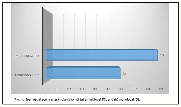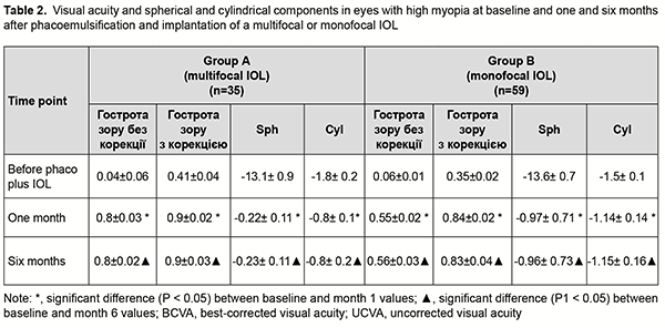 Introduction Cataract phacoemulsification has become the most common type of cataract surgery. In the case of cataract phacoemulsification, the risk of intra- and post-operative complications is reduced because the ocular cavity is almost closed during surgical manipulations, a small self-sealing incision is used and reliable intracapsular fixation of the intraocular lens (IOL) can be used [1]. Myopes comprise 10-25% of patients presenting with cataract. Thinning and extension of the ocular coats and lens ligaments, destruction and liquefaction of the vitreous, and impaired ocular hemodynamics and hydrodynamics are characteristic for myopic eyes (especially, eyes with high myopia) [1], and may be risk factors for phacoemulsification. Myopic eyes have a thicker but substantially weaker posterior lens capsule, and weaker ciliary zonules, compared to emmetropic eyes [2]. These facts may explain a high risk of posterior capsular rupture and rupture of the lens apparatus in cataract surgery during instrument contact or excessive build-up of pressure inside the capsular bag (hydrodissection and hydrodelineation), lens polishing, and aspiration of equatorial cortical lens material. Compromised capsular bag integrity and hydrodynamic shock waves hitting the anterior vitreous have been reported to increase the likelihood of postoperative proliferation in the vitreous and subsequent traction retinal detachment [3]. A variety of potential complications during phaco in myopic eyes make the choice of IOL type very important. Numerous IOLs from various manufacturers and with various characteristics are currently available, and the surgeon can select the model based on his/her clinical experience and patient’s preferences [4]. A monofocal IOL provides clear vision at one particular distance and is a preferred type of IOL for implantation in myopic eyes for most phaco surgeons. Myopic refraction is left in such eyes; this provides the patient with a usual mode of vision, but not with maximum visual acuity at distance. With advent of multifocal IOLs to the Ukrainian market, the question arose whether it is reasonable to use them in cataractous eyes with high myopia. Previous studies on multifocal IOLs have determined that the success of refractive correction with a multifocal IOL requires achieving a distance visual acuity of 0.7 or better and a near visual acuity of 0.5 or better [5]. More than 85% of patients did not require glasses after they received multifocal IOLs [5]. It should be taken in account that the IOLs of this type vary in design and some of them require a well functioning pupil and should be aligned correctly to implement their bifocal functions fully [6-9]. This study was conducted because there is no agreement among cataract surgeons as to whether it is feasible to implant multifocal IOLs in cataract phacoemulsification in eyes with high myopia. The purpose of this study was to compare treatment outcomes among eyes with high myopia which underwent phacoemulsification with implantation of monofocal versus multifocal IOLs. Material and Methods We reviewed treatment outcomes of phacoemulsification with IOL implantation for 55 patients (93 eyes) with cataract and high myopia. Study eyes were divided into two groups depending on the type of IOL implanted. Group A included 22 patients (38 eyes) with a multifocal IOL implanted. In this group, there were 11 women (55%) and 9 men (45%), and patient age ranged from 29 years to 73 years (mean age, 52 ± 2.9 years). Group B included 32 patients (55 eyes) with a monofocal IOL implanted. In this group, there were 18 women (51.4%) and 16 men (48.6%), and patient aged ranged from 32 years to 78 years (mean age, 58 ± 2.1 years). That is, the groups were comparable with regard to age and gender. Preoperatively, patients underwent a routine eye examination which included automated refraction, visual acuity, perimetry, Amsler test, phosphene test, tonometry, biomicroscopy, direct ophthalmoscopy, and, if possible, retinal examination using a Goldmann lens. In addition, they underwent a special examination for the patients being prepared for phaco plus IOL implantation which included ultrasound A- and B-scanning (Alcon; USA), optical biometry (IOL Master 700 - Carl Zeiss Meditec AG, Jena, Germany), and endothelial microscopy (SP-3000P, Topcon Corporation, Tokyo, Japan). The Haigis and SRK-T formulas were used for IOL calculation. The contrast sensitivity was determined as per the method of Birich et al [10], using the matrix contrast optotype chart TB-1, where, in a way similar to the Golovin-Sivtsev chart, modified Landolt rings are arranged top down in a particular order according to the international vision assessment standards. The contrast of modified Landolt rings decreases along a chart line left to right from 1 to 0.2, which corresponds to contrast sensitivity of 1 to 5. The separating power was recorded for the number located in the vertical row of numbers against the particular chart line. The contrast sensitivity was assessed using the table developed by the authors, with a value of 5 conforming to excellent contrast sensitivity; 3, to good; 2.5, to satisfactory; 2, to low; and 1.5-1, to poor contrast sensitivity. Of the 38 eyes which received multifocal IOLs in group A, 11 received AT Lisa tri 839 (Carl Zeiss, Germany); 16, MP Lisa 809M (Carl Zeiss); seven, MULTIDIFF 605 (Appasamy Associates, India); one, AT LARA 829MP (Carl Zeiss); and three, AcrySof® IQ ReSTOR® (Alcon, USA). Of the 55 eyes which received monofocal IOLs in group B, 19 received CT LUCIA 601P (Carl Zeiss); 18, CT ASPHINA 409MV (Carl Zeiss); eight, NASPRO BBY (Appasamy Associates); three, SL-902 (US-optics, Ukraine); two, ACRYFOLD 601Y (Appasamy Associates); one, Supraphob BBY (Appasamy Ocular Devices (P) LTD, India); one, Acry sof IQ SN 60 WF (Alcon); and two, Eyeol LW5752R (Eyeol UK, UK). Cataract surgeries were performed by three surgeons with an individual induced astigma