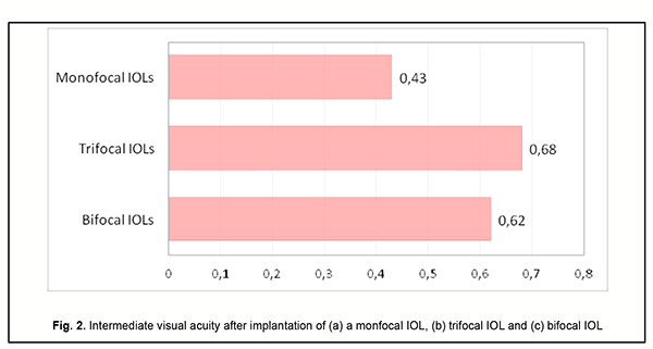 Although the amount of difference in near vision acuity between the two groups was substantial, no patient in either group wore glasses for work during the postoperative period. This indicated that myopic eyes became well adapted for near work. Patients with implanted monofocal IOLs were generally satisfied with their treatment outcomes, but had to wear their glasses for distance which caused some visual discomfort. Eyes with a trifocal IOL (n=13) showed the best intermediate visual acuity (0.68 ± 0.11), followed by eyes with a bifocal IOL (n=25) (0.62 ± 0.11) and eyes with a monofocal IOL (n=54) (0.43 ± 0.09) (Fig. 2).