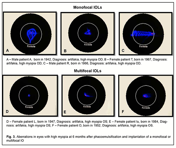 Discussion Although there have been numerous reports on the advantages of implanting a multifocal IOL after phacoemulsification, the question of selecting an IOL for eyes with high myopia is still open. We found phacoemulsification with IOL implantation to improve visual acuity in eyes with high myopia in both groups. However, implantation of a multifocal IOL was found to result in good visual acuity at near and far distances in high myopes. Compared to those with an implanted monofocal IOL, these patients are better adapted to new conditions of vision, which significantly improves their quality of life. Our findings are in agreement with those of others. Morozova and Kerimov [11] studied patient satisfaction with treatment outcomes, independence from spectacles and dysphotopsia occurring after implantation of a multifocal IOL on the basis of personal experience and literature review. They noted that, although there is no ideal design for a multifocal IOL, at the later follow-up time points, there was a high level of subjective satisfaction of those patients who underwent implantation of a multifocal IOL, with a significant reduction in the risk and severity of light-associated events (halo, flicker, etc.) in the postoperative period. Among patients experiencing these events, tolerance to dysphotopsia commonly developed before month 6 after surgery. In addition, uncorrected near visual acuity and contrast sensitivity were found to be improved with time, although there was no change in refractive error. Those authors believe that adaptation to an implanted multifocal IOL is associated with neuroadaptation of the whole visual system to it, but this process does not require any effort from the patient. Tur and colleagues [12] reviewed the medical records of 405 patients (668 eyes) with high myopia who had undergone implantation of a multifocal IOL. They noted that implantation of a multifocal IOL in eyes with high myopia resulted in an improvement in visual acuity to 1.0 even in the presence of refractive amblyopia, with maintenance of good visual acuity at near. Tur and colleagues [12] believe that this improvement in vision was associated with an increase in the area of the image falling onto the retina as well as a decrease in optical aberrations. Our wavefront analysis of eyes which underwent phacoemulsification showed that, the eyes with an implanted multifocal IOL had less number and area of total spherical aberration compared to those with an implanted monofocal IOL. In the current study, patients of both groups could read without glasses, but the eyes with an implanted multifocal IOL had significantly better visual acuity both at near and far distances compared to those with an implanted monofocal IOL. It is likely that the lower visual acuity at far distances in the eyes with an implanted monofocal IOL was associated with an amount of target residual myopia for an eye with a monofocal IOL (-1.0 D), but, nevertheless, this approach enabled them to feel comfortable under the usual conditions. The authors make the following conclusions. First, among the eyes with high myopia, the percentage increase in uncorrected visual acuity was larger in those with an implanted multifocal IOL (76%) than in those with an implanted monofocal IOL (49%), and the difference was significant (р < 0.05). Second, the increase in near visual acuity was by 33% larger in those with an implanted multifocal IOL than in those with an implanted monofocal IOL, which significantly improved their quality of life, enabling them to quit wearing their glasses. Finally, our findings demonstrate that high myopia is not a contraindication for implanting a multifocal IOL.