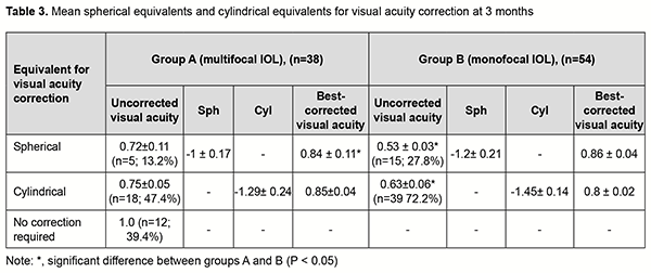 In the eyes of group B, mean UCVA increased by 49% to 0.55 ± 0.02 and mean BCVA, by 78% to 0.84±0.02, whereas mean Sph and mean Cyl values were -0.85 ± 0.11 D and -0.94 ± 0.12 D, respectively. These results maintained for six months, and the difference between values at month 1 and month 6 was not statistically significant (p > 0.05) for all cases. After phacoemulsification and IOL implantation, in the eyes of group A, mean spherical component decreased by 12.88 ± 0.2 D to -0.22±0.11 D, whereas mean cylindrical component decreased by 1.0 ± 0.1 D to -0.8 ± 0.1 D as assessed by autoreftactometry. In addition, at one month, in the eyes of group B, mean spherical component decreased by 12.63 ± 0.12 D to -0.84 ± 0.02 D, and approached a target value, whereas a change in a cylindrical component was not statistically significant. It is noteworthy that most patients in both groups did not use cylindrical correction even when it was beneficial for visual acuity. Table 3 presents the data on the cylindrical component of refraction and its influence on the visual acuity after implantation of a monofocal or multifocal IOL in eyes with high, uncomplicated myopia.